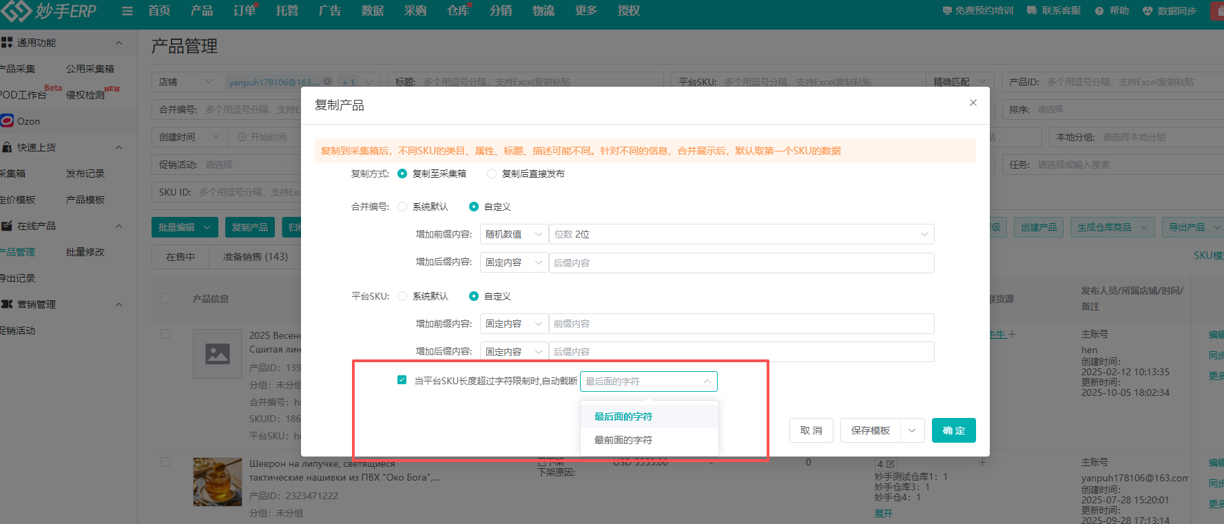 (5)可勾选当SKU长度超过字符限制的时候,自动截断前面/后面的字符