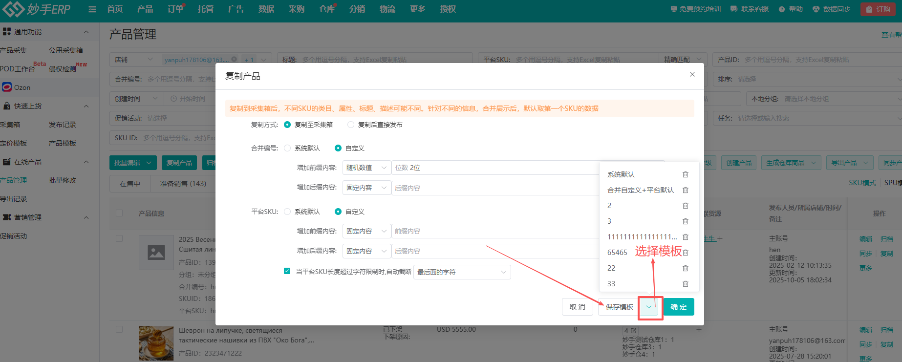 (6)如果需要保存此模板,方便后续使用,可点击【保存模板】,后续在复制产品的时候点击三角标,并点击此模板后,即可同步保存的内容