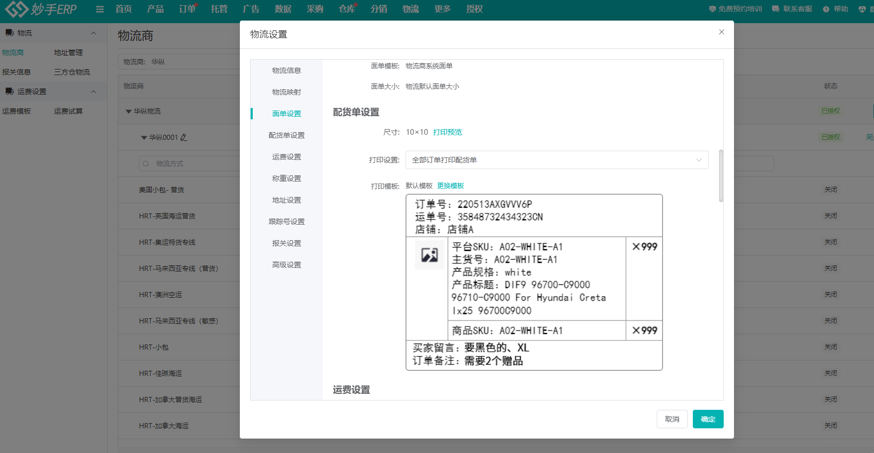 2、完成以上所有设置,处理订单时即可选择该物流渠道完成打单发货