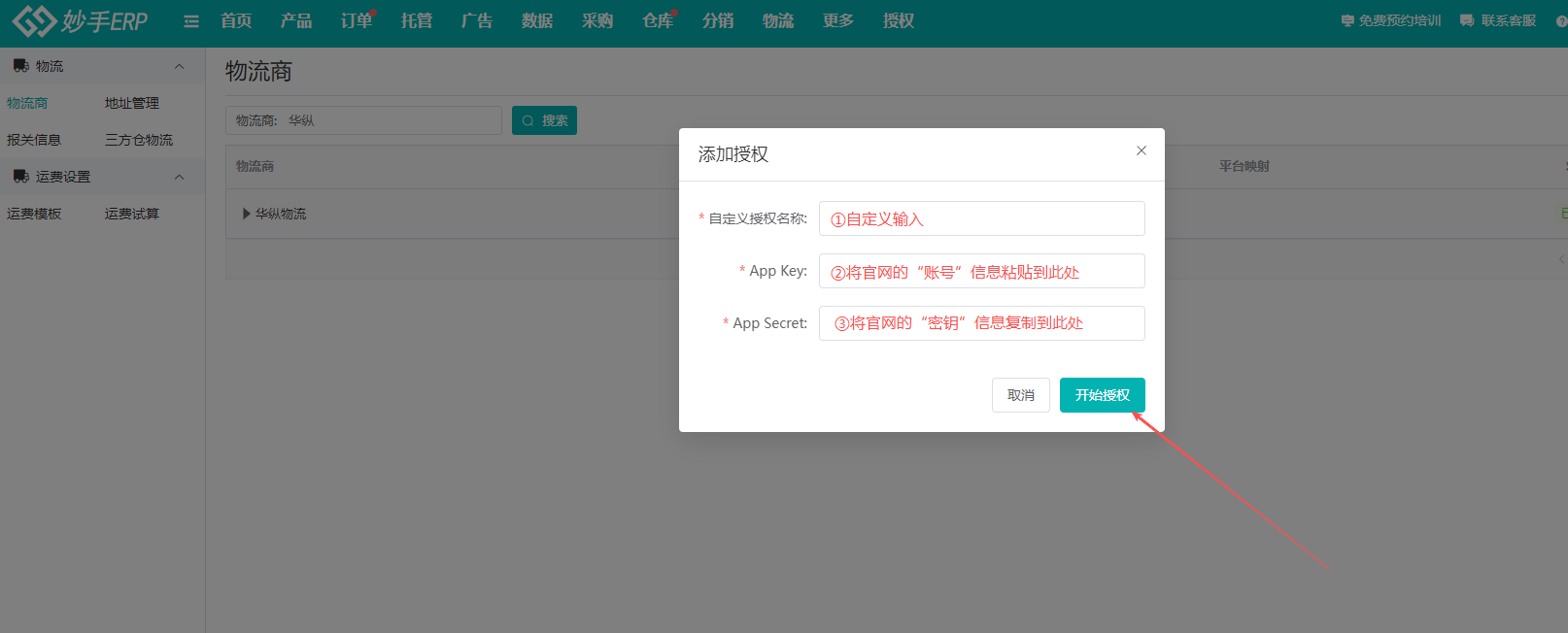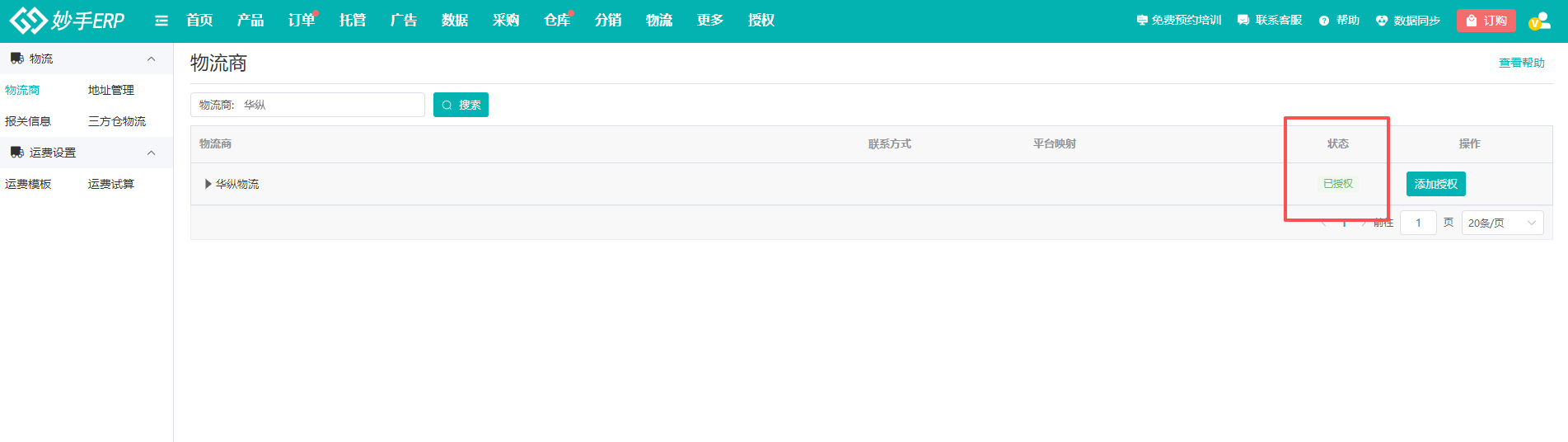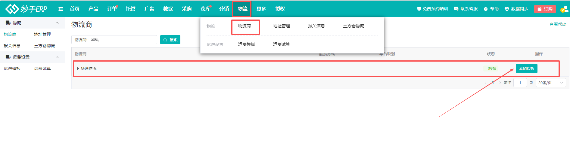 (2)进入妙手ERP,选择物流=>物流商=>找到华纵物流,点击【添加授权】