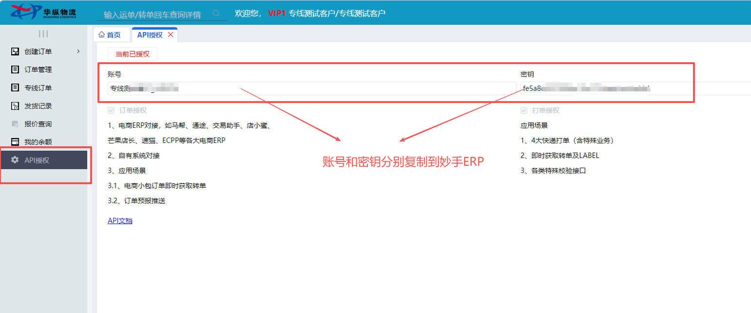 (1)登入华纵物流,左侧功能菜单点击API授权,分别复制账号和密码到妙手ERP,具体位置可查看下图框选区域