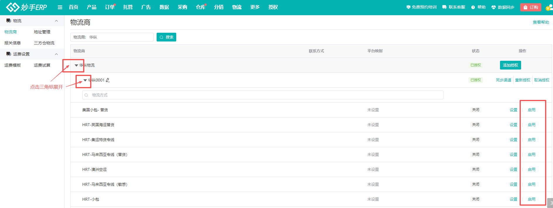 (5)授权后,点击三角标展开,选择需要启用的物流渠道,点击启用