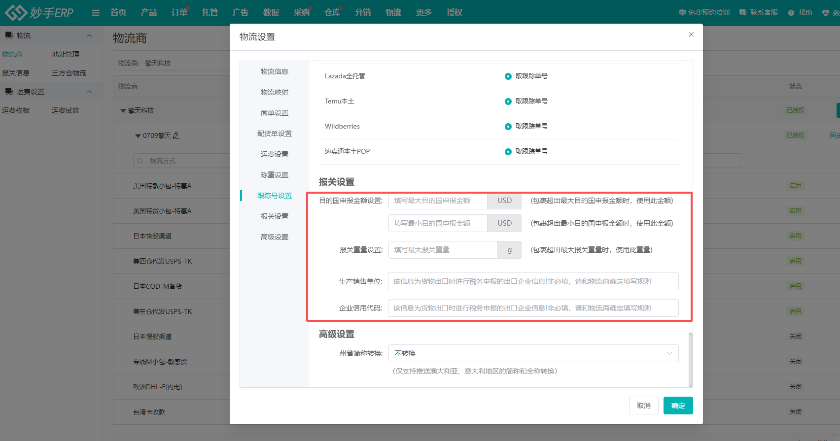 2、用户可以和物流商确认是否支持填写以上信息,目前妙手ERP支持上传【出口企业名称】、【企业信用代码】、【出口申报金额】的物流商为(持续更新中):