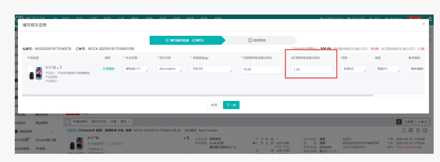 (3)点击申请物流后,在弹窗中先填写报关信息,再点击【下一步】