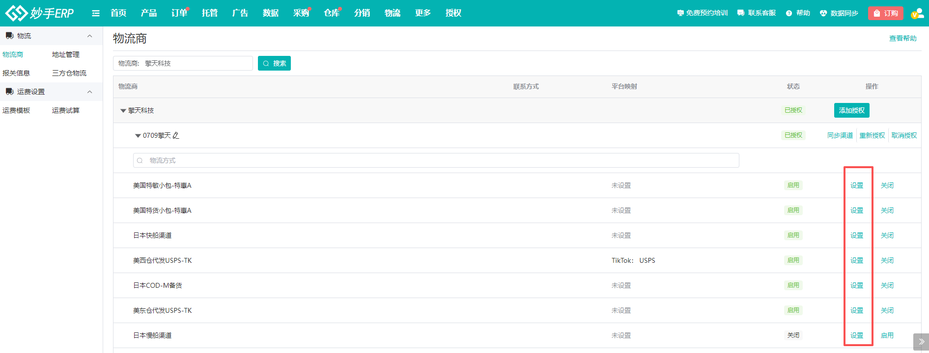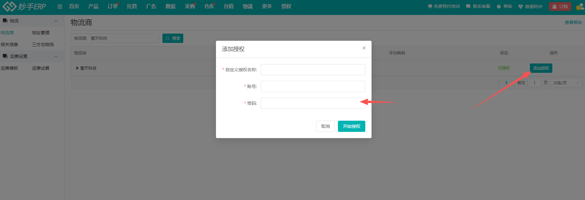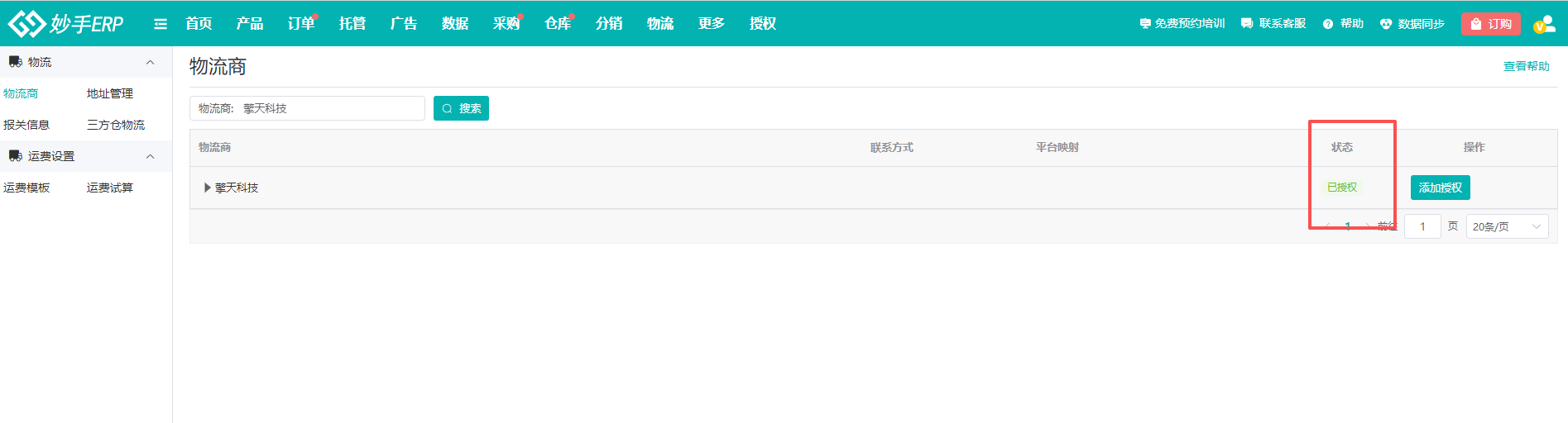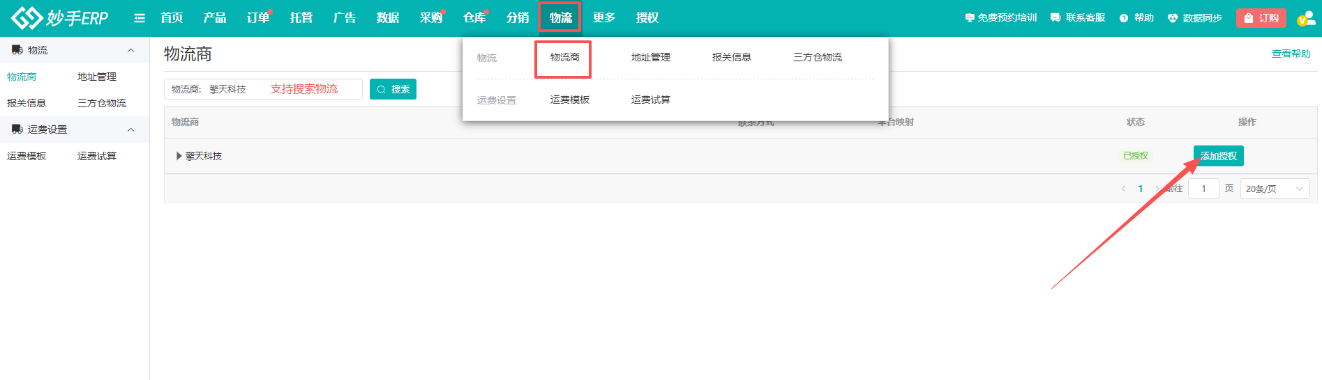 (1)进入妙手ERP,选择物流=>物流商,找到需要授权的物流后,点击【添加授权】