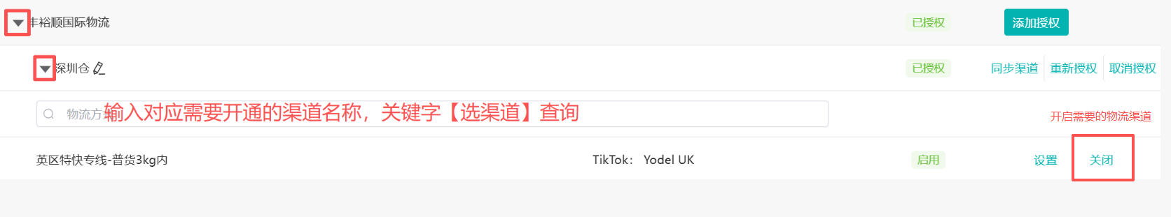 3、授权成功后,点击三角标识,可打开点击【开启】,开启需要的物流渠道,可与物流商确认渠道