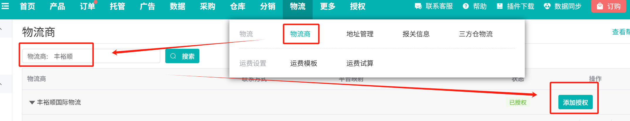 操作流程:物流=>物流商=>搜索丰裕顺物流=>添加授权=>输入授权码