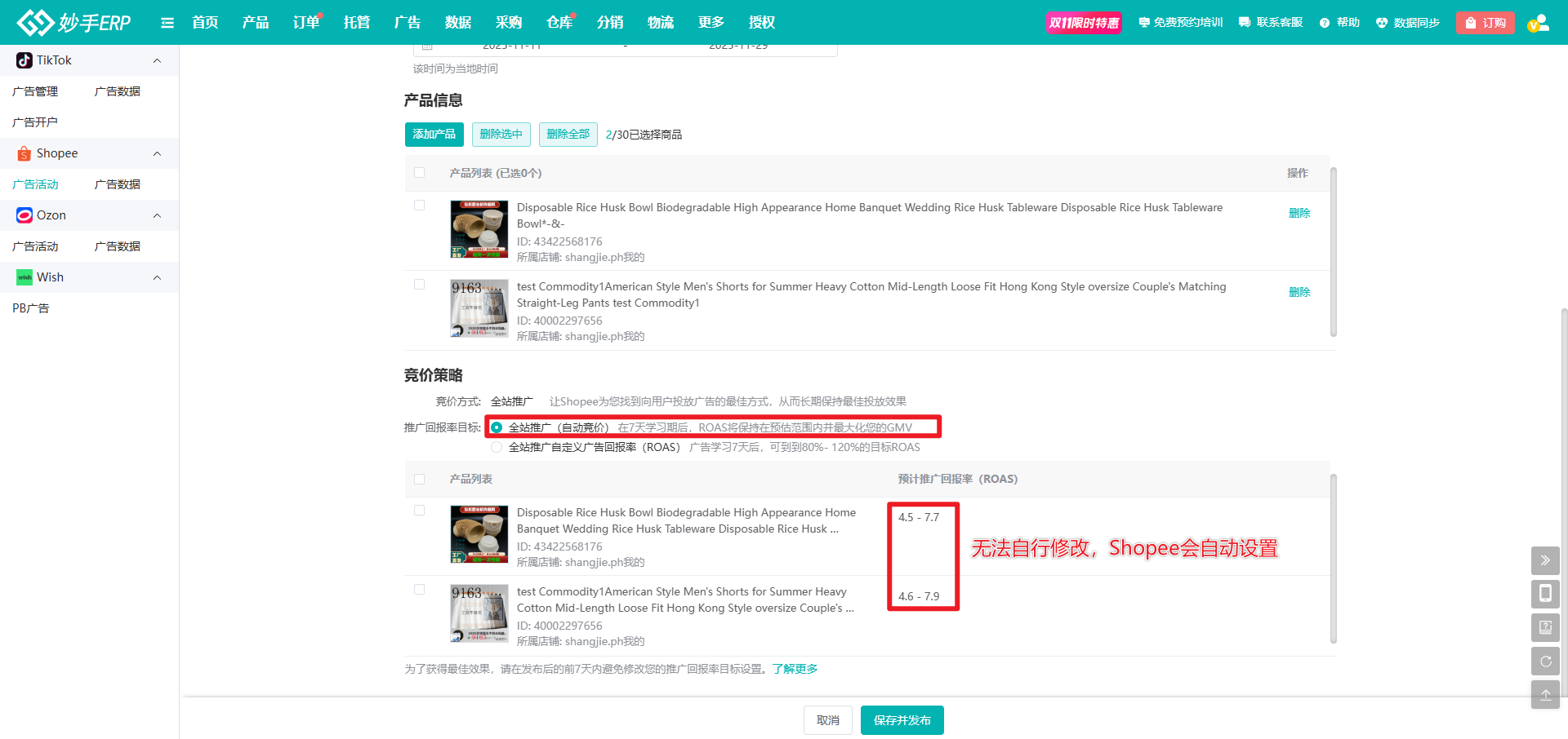 ①推广回报率目标:全站推广(自动竞价),在7天学习期后,ROAS将保持在预估范围内并最大化您的GMV(由Shopee官方设置ROAS)