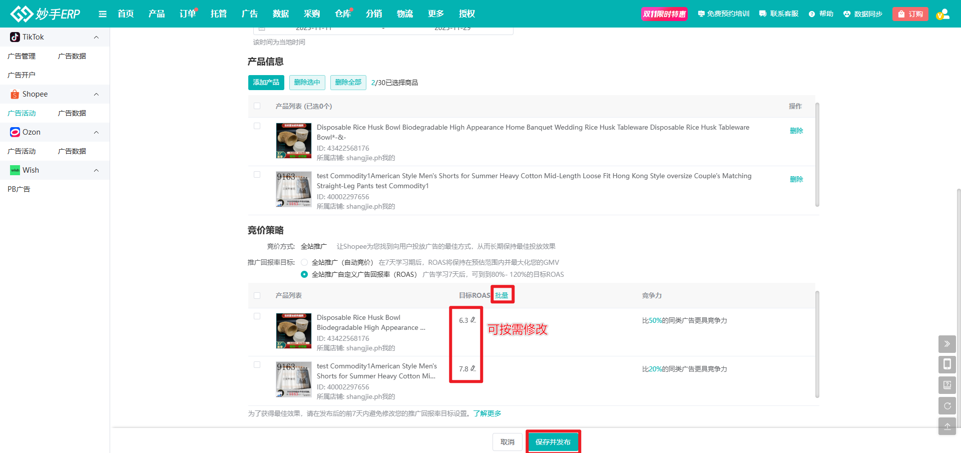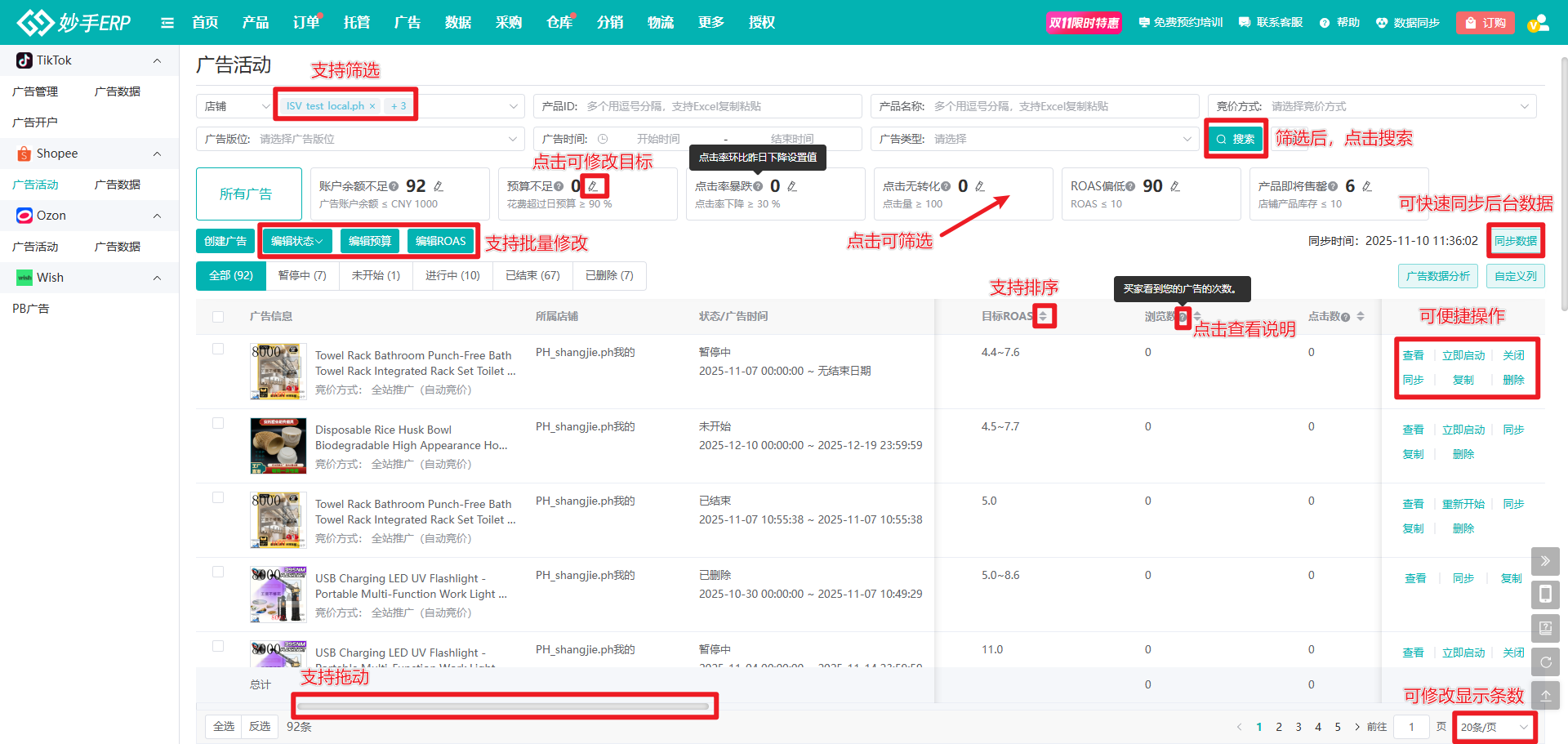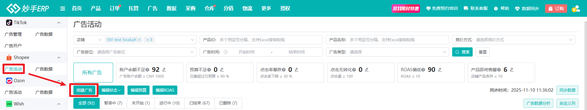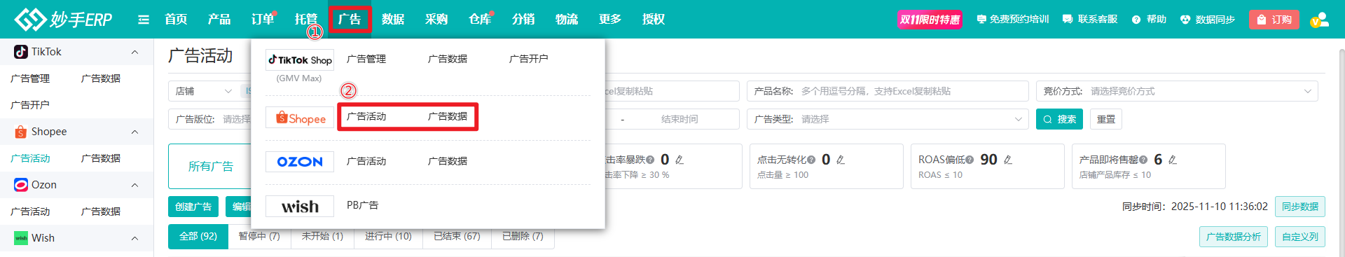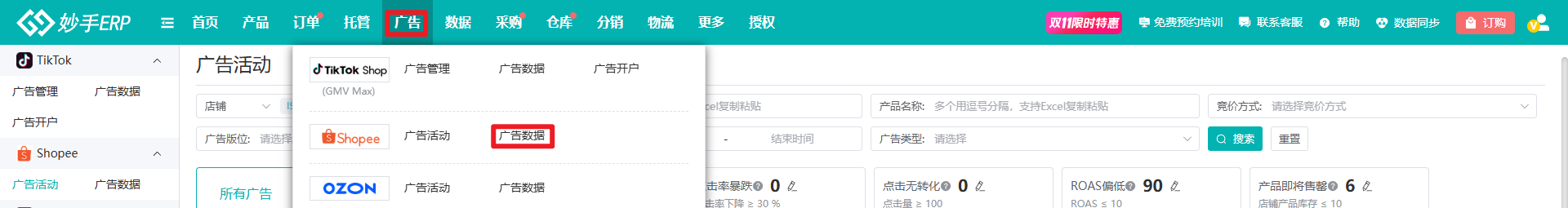 功能入口:进入妙手ERP=>广告=>Shopee=>广告活动/广告数据