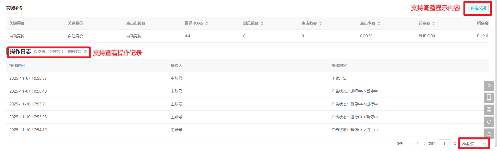 妙手Shopee广告数据页面精心整合了:浏览、点击、转化、花费、投入产出比等方面关键指标,