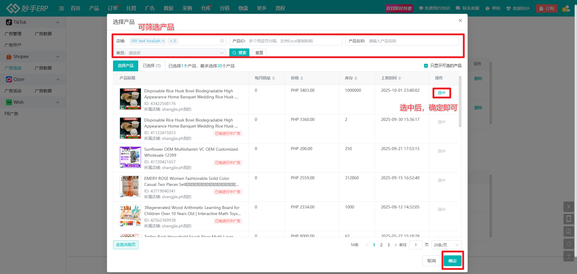 ①添加产品:按需添加需加入广告的产品,支持筛选,最多可选30个产品
