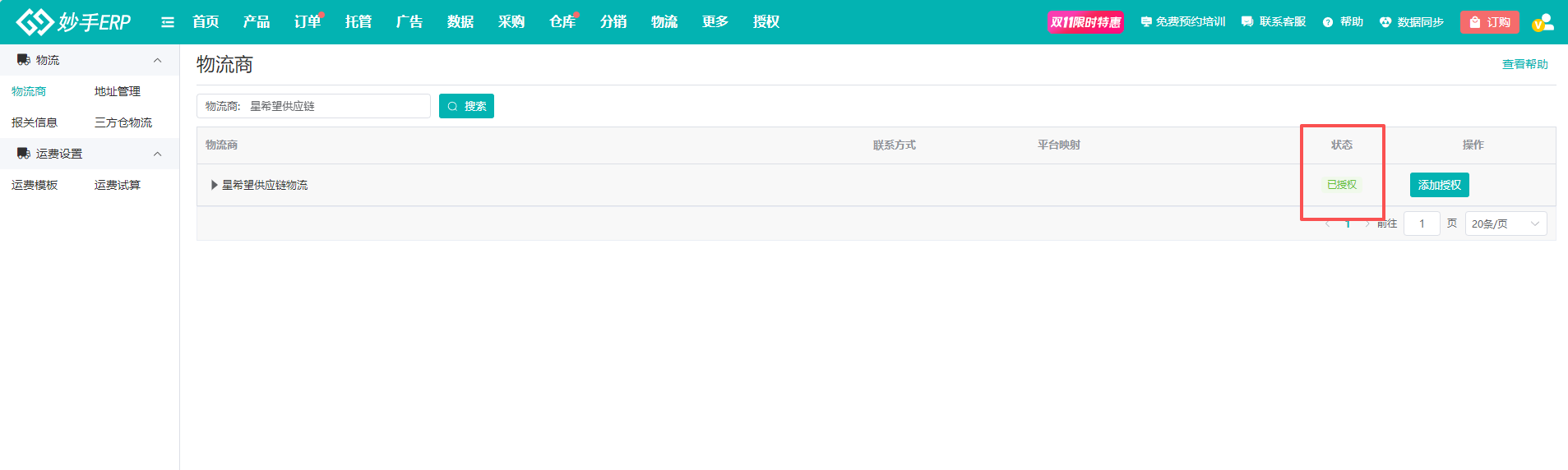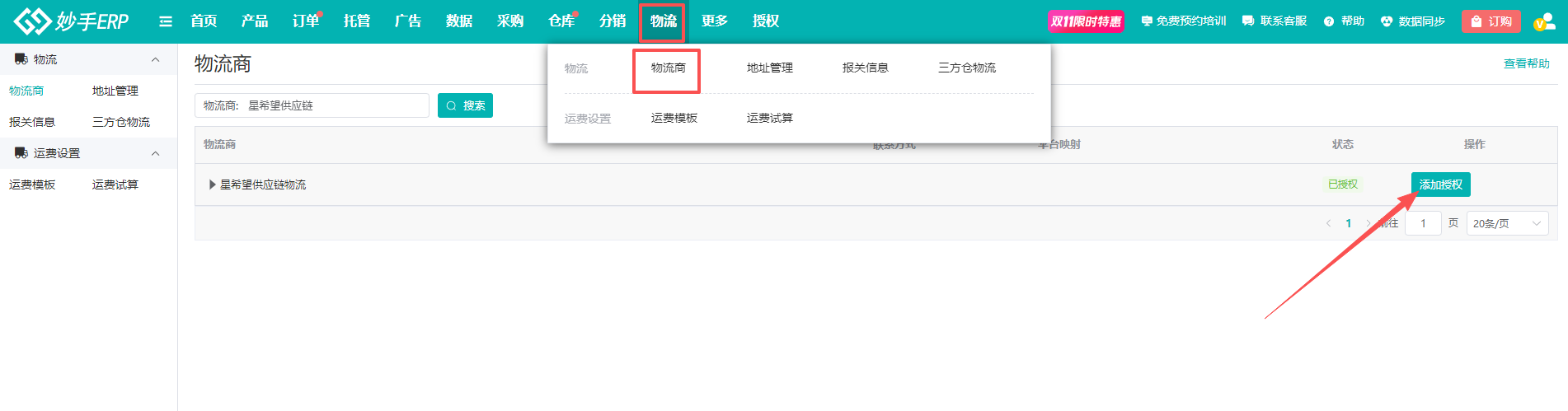 (1)进入妙手ERP,选择物流=>物流商=>找到星希望供应链物流,点击【添加授权】