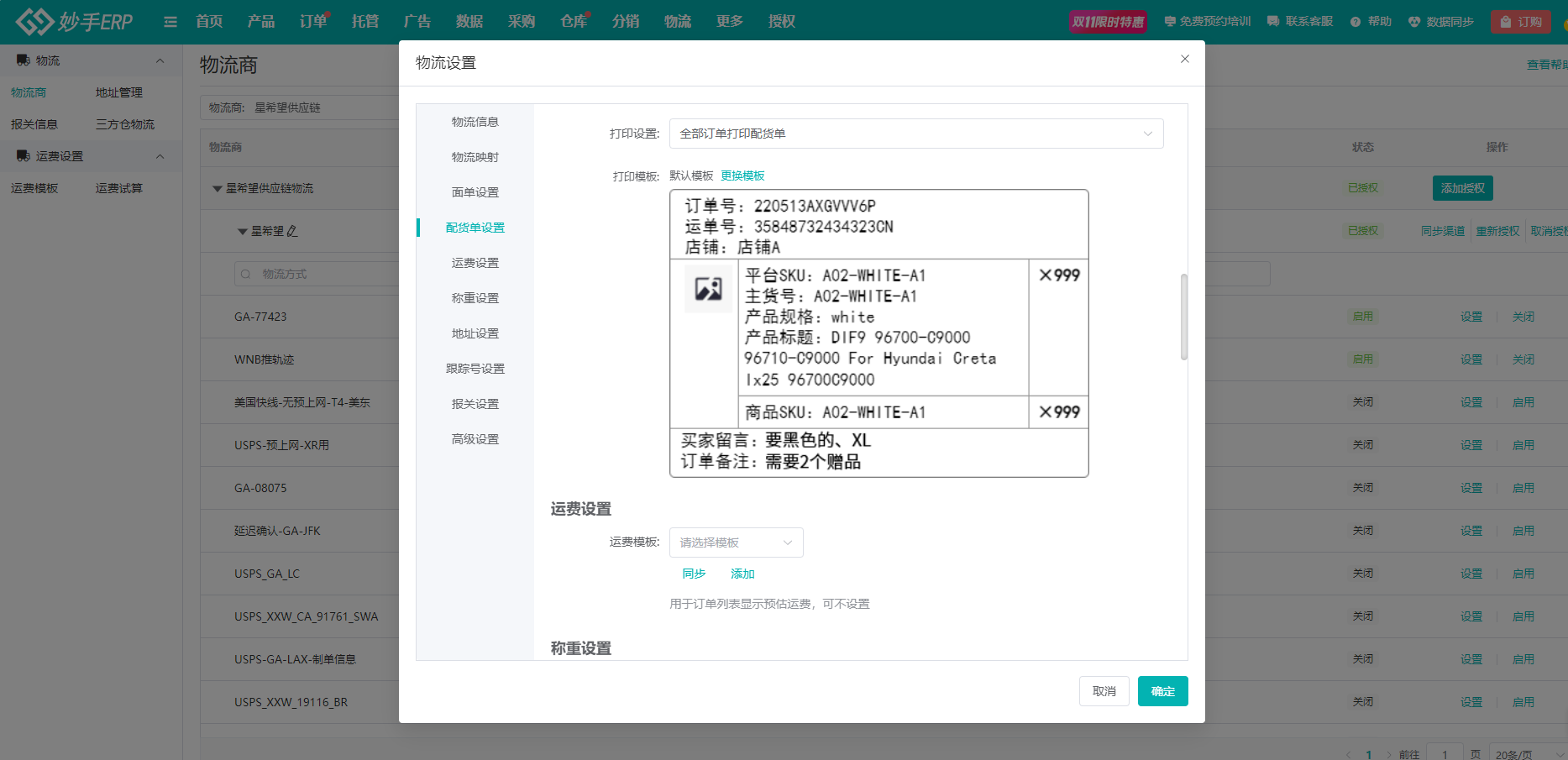 完成以上所有设置,处理订单时即可选择该物流渠道完成打单发货