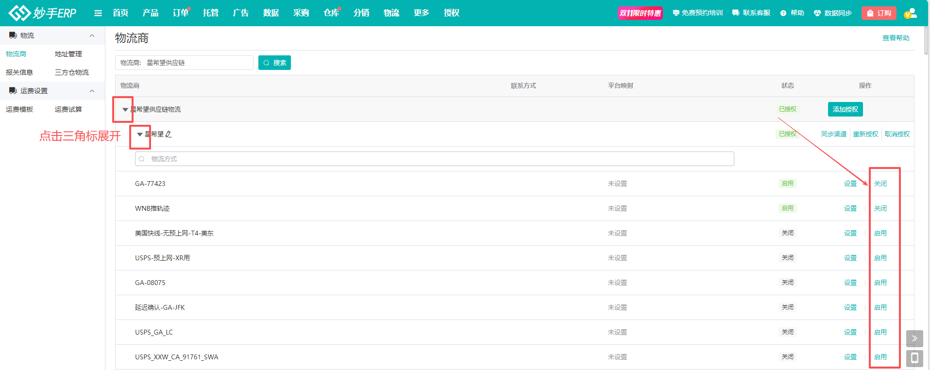 (4)授权后,点击三角标展开,选择需要启用的物流渠道,点击启用