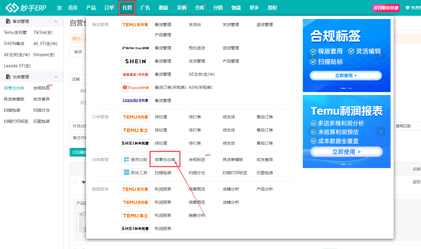 1、部分托管平台支持使用自营仓出库,比如Temu、AE全托、AE半托、Shein、Lazada全托,自营仓出库的流程说明可跳转查看:托管平台发货-自营仓出库