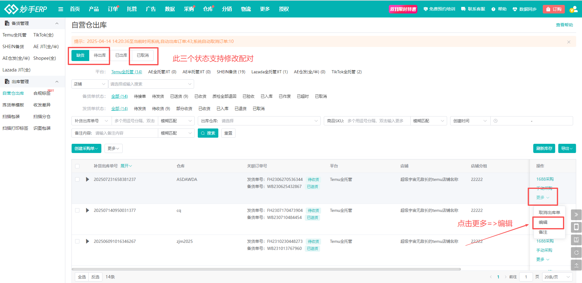 (1)在缺货、待出库状态下,找到出库单,点击更多=>编辑