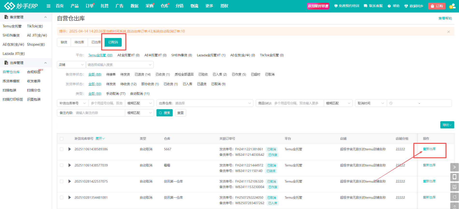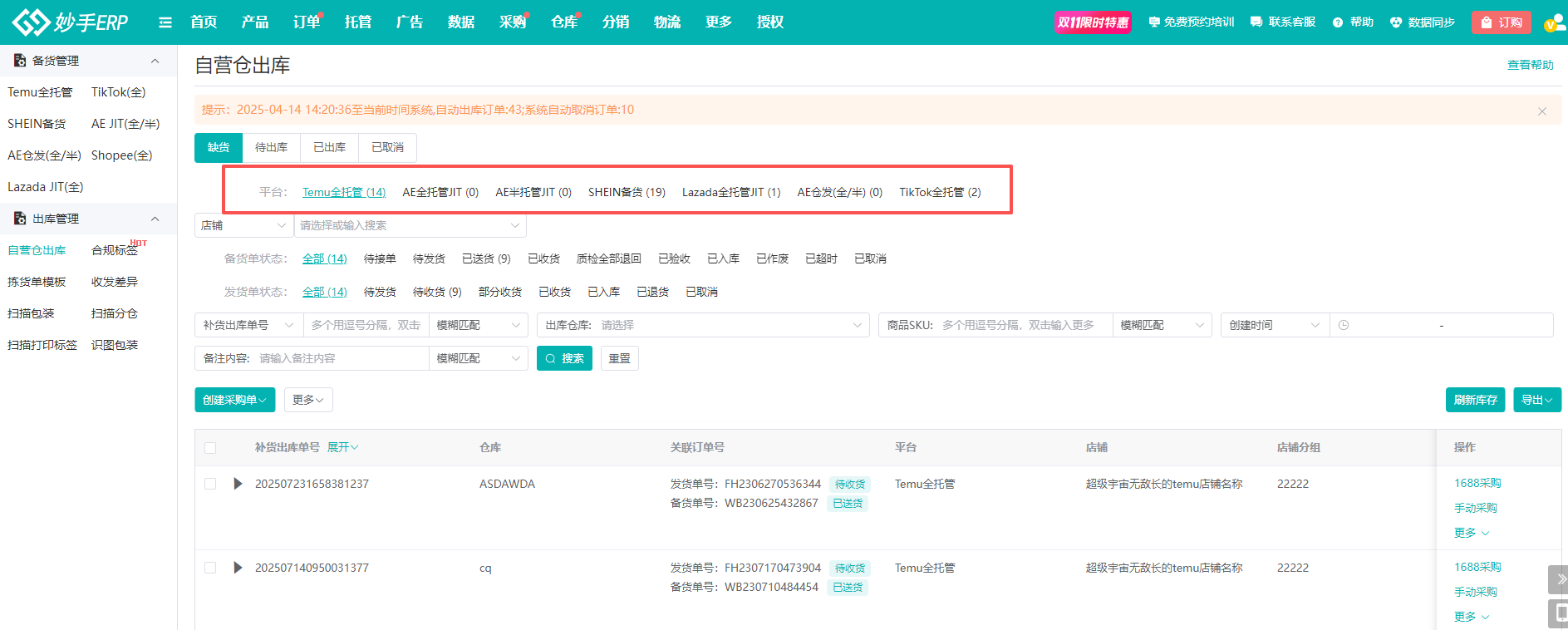 2、在托管平台的备货管理中创建的出库单,会显示在自营仓出库中,支持筛选平台
