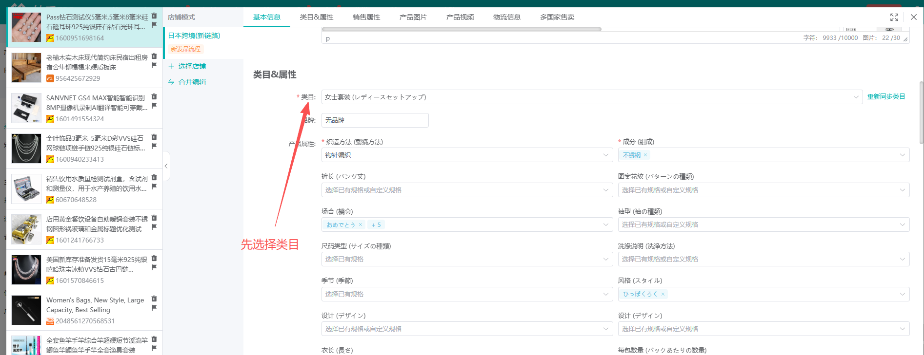 ①产品在编辑之前,需要先选择预发布店铺,支持批量选择和单产品选择
