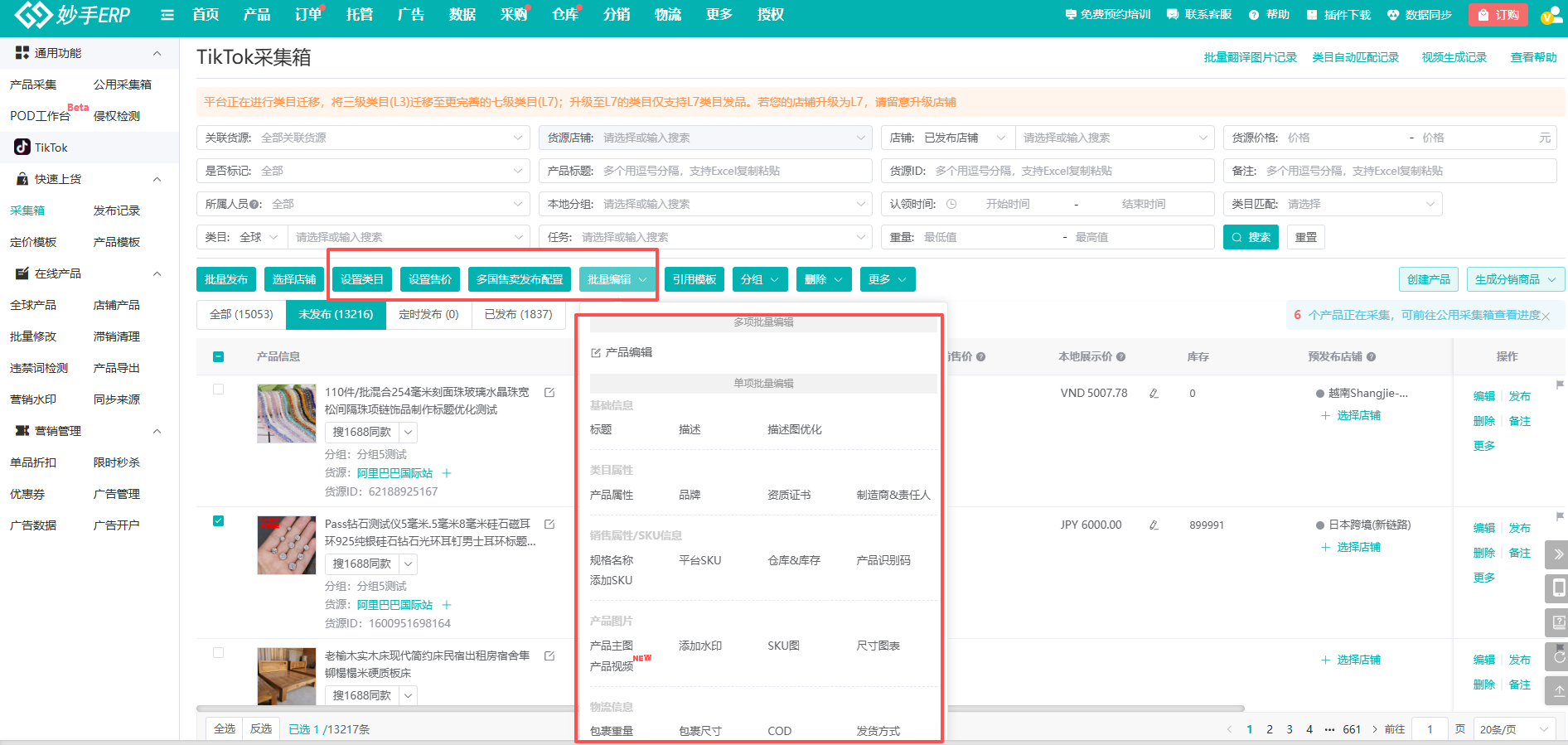 1、近期TikTok针对所有市场,将跨境商家的发品链路进行了升级,用户在卖家中心完成店铺升级后,即可在妙手ERP中使用新链路发品