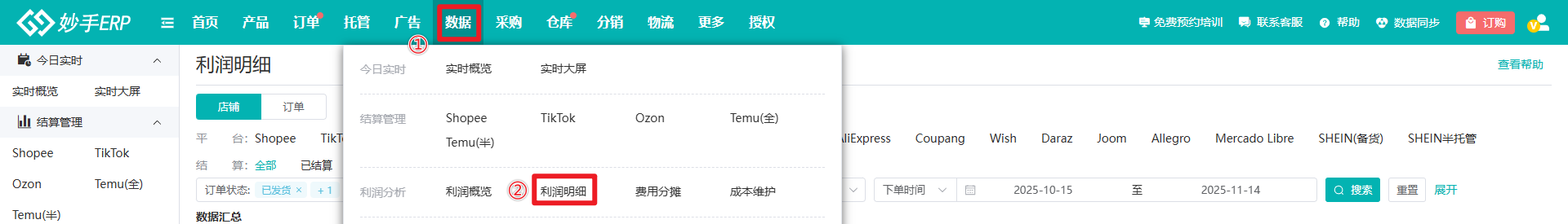 1、进入妙手ERP=>数据=>利润明细