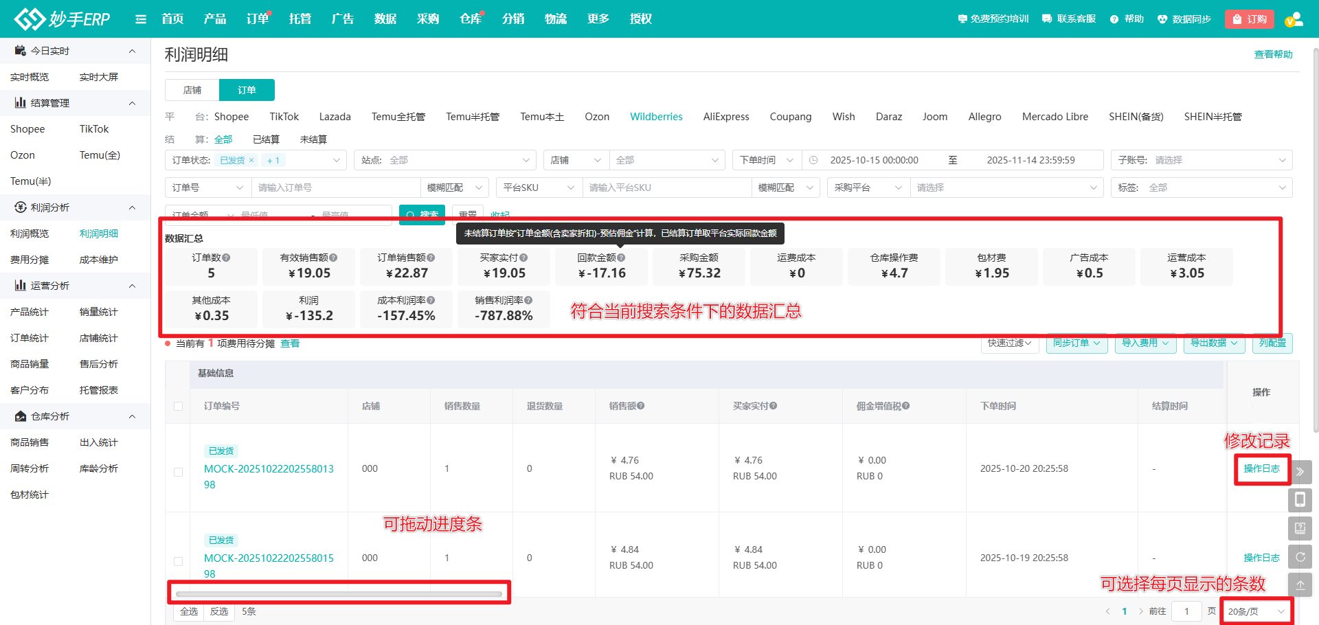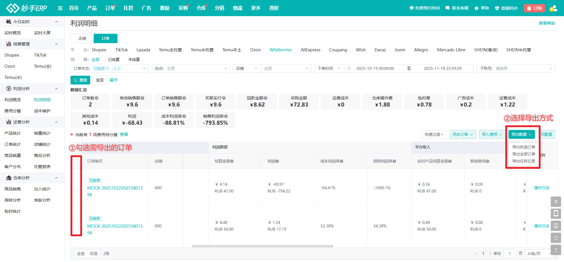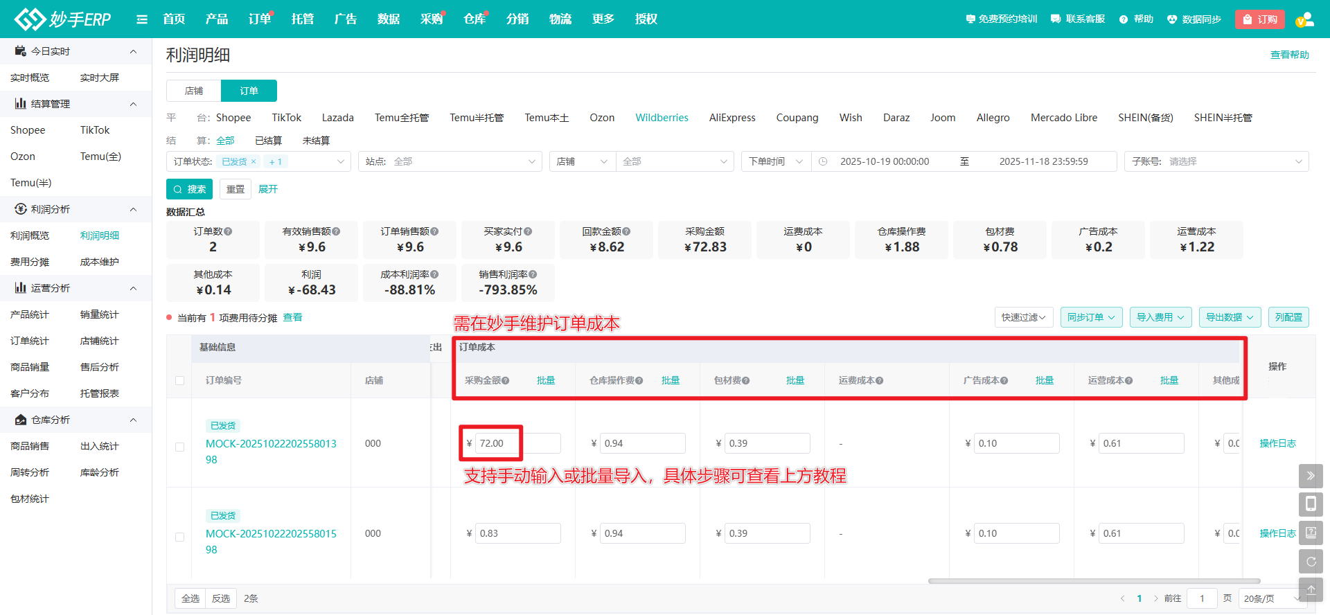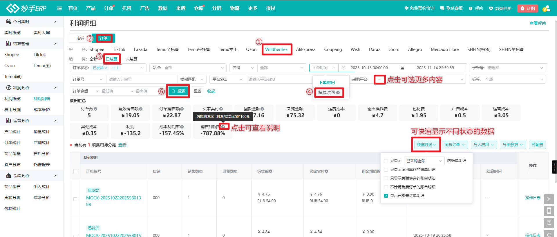 操作流程:数据=>利润明细=>Wildberries=>订单=>选择结算状态,按需筛选订单=>填写或确认订单成本=>查看利润及各项平台结算数据