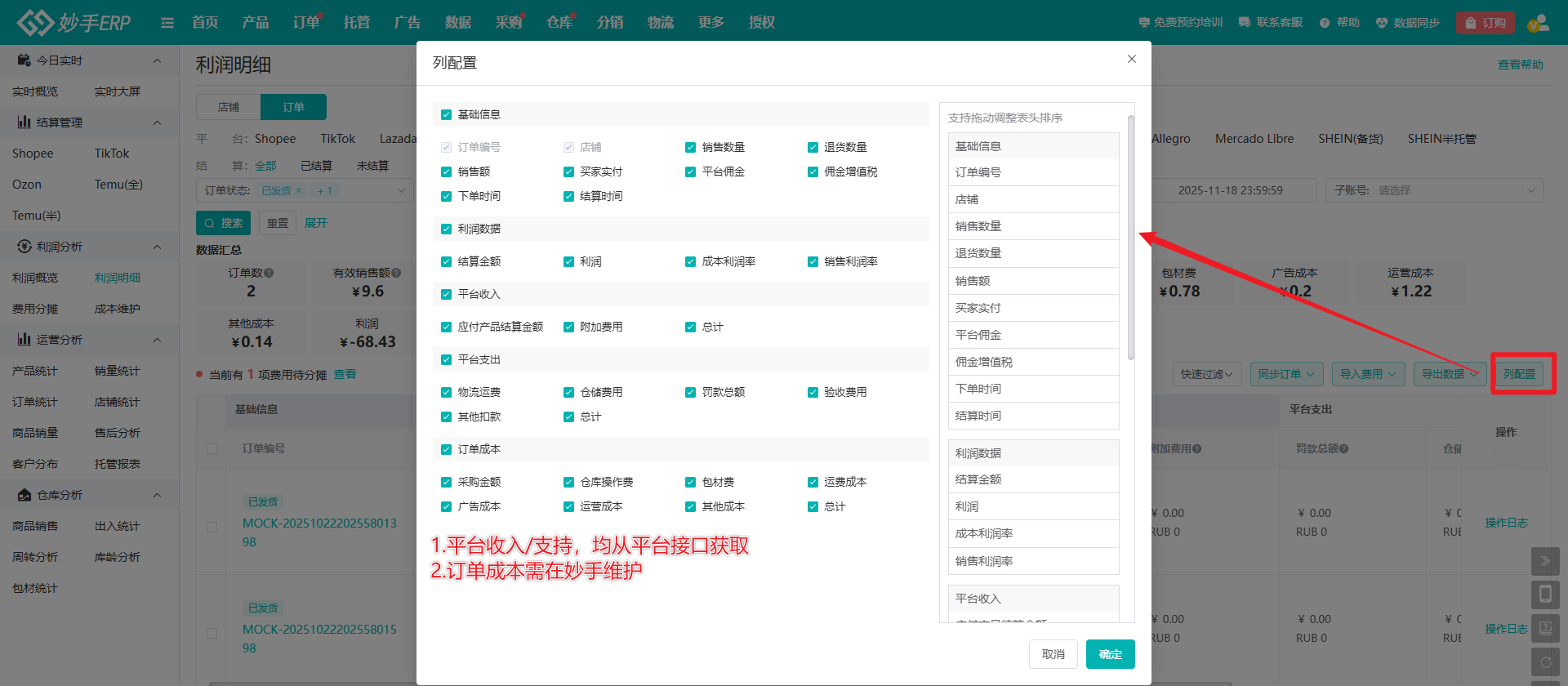 4、列配置可选择需要展示的字段,亦可拖动,设置其排序;订单信息,平台收入/支持会自动从平台接口获取,用户仅需维护订单成本下的数据,点击此处跳转如何维护订单成本