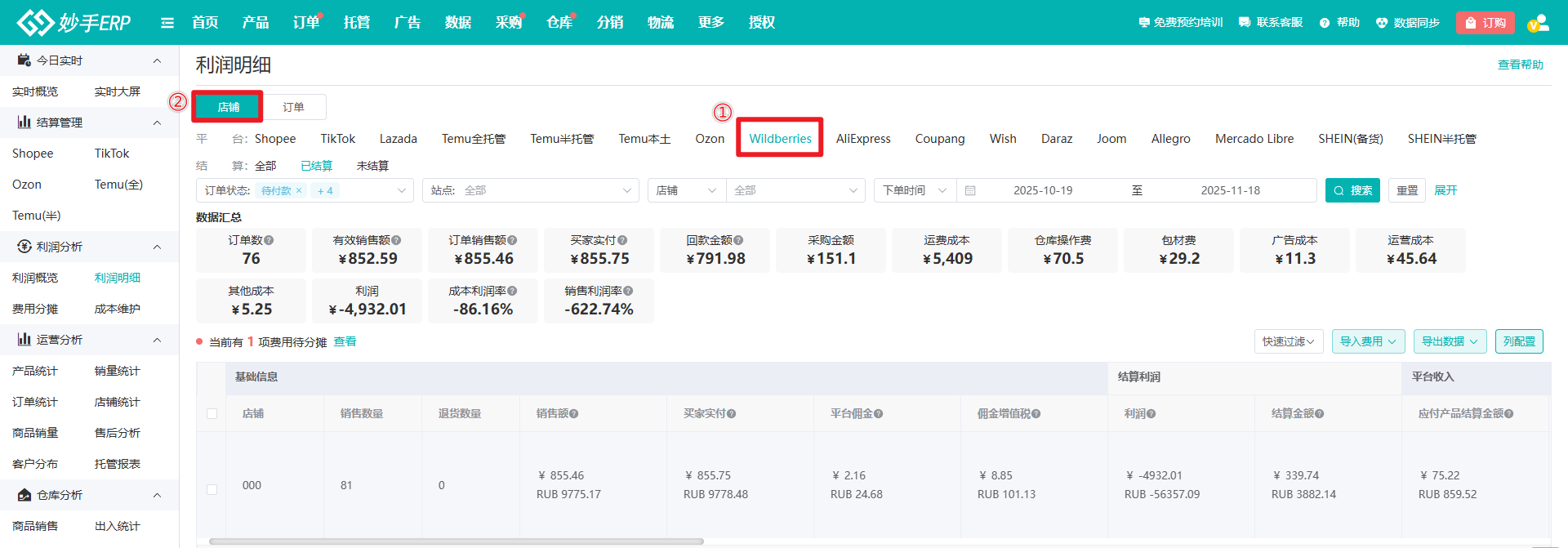 操作流程:数据=>利润明细=>Wildberries=>店铺=>选择结算状态,按需筛选订单=>已在订单维度填写订单成本=>查看利润及各项平台结算数据