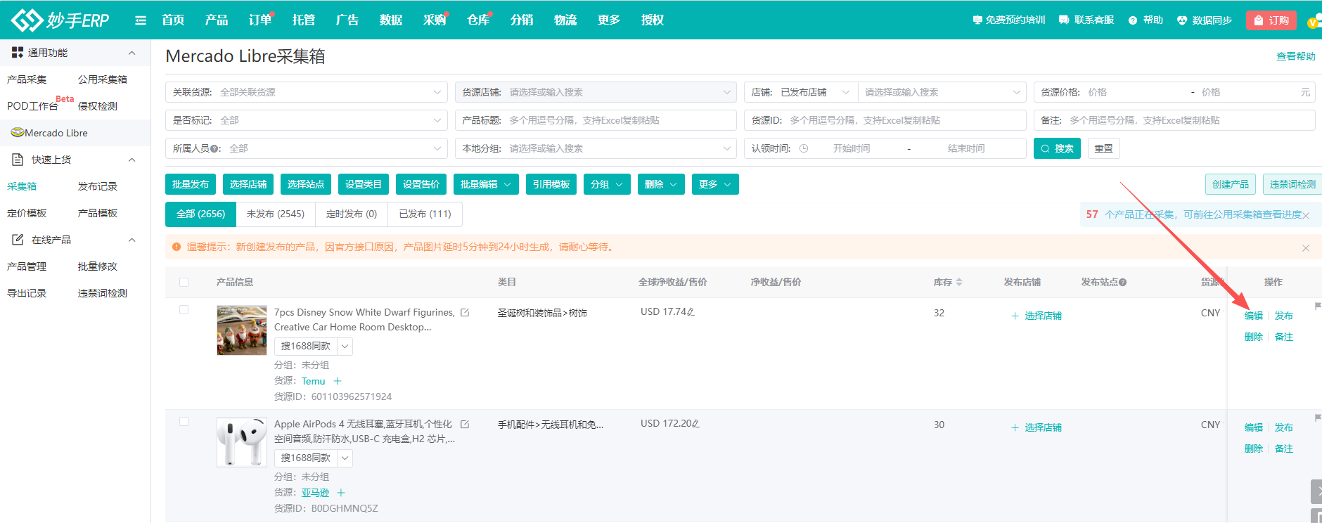 (1)在采集箱中找到需要修改产品,点击右侧的【编辑】