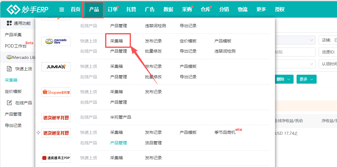 1、进入妙手ERP=>美客多=>采集箱