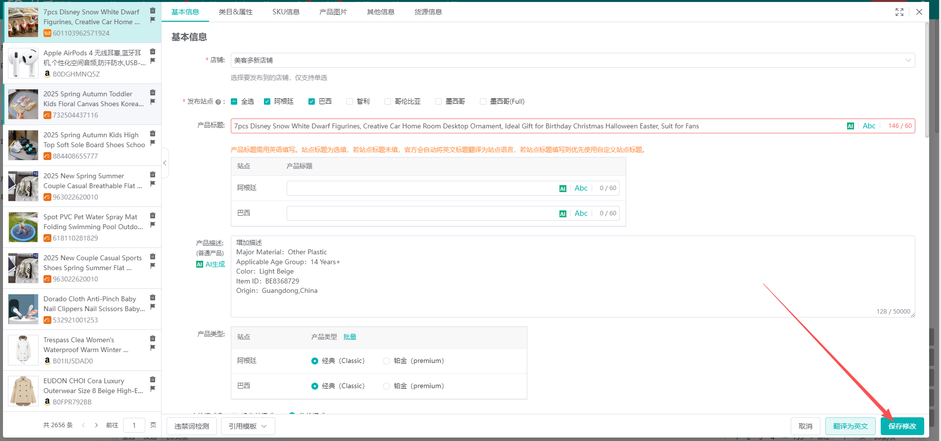 (2)进入产品编辑后,先选择店铺,再勾选需要发布的站点,勾选站点后在标题下方会出现设置弹窗,根据站点设置对应标题即可