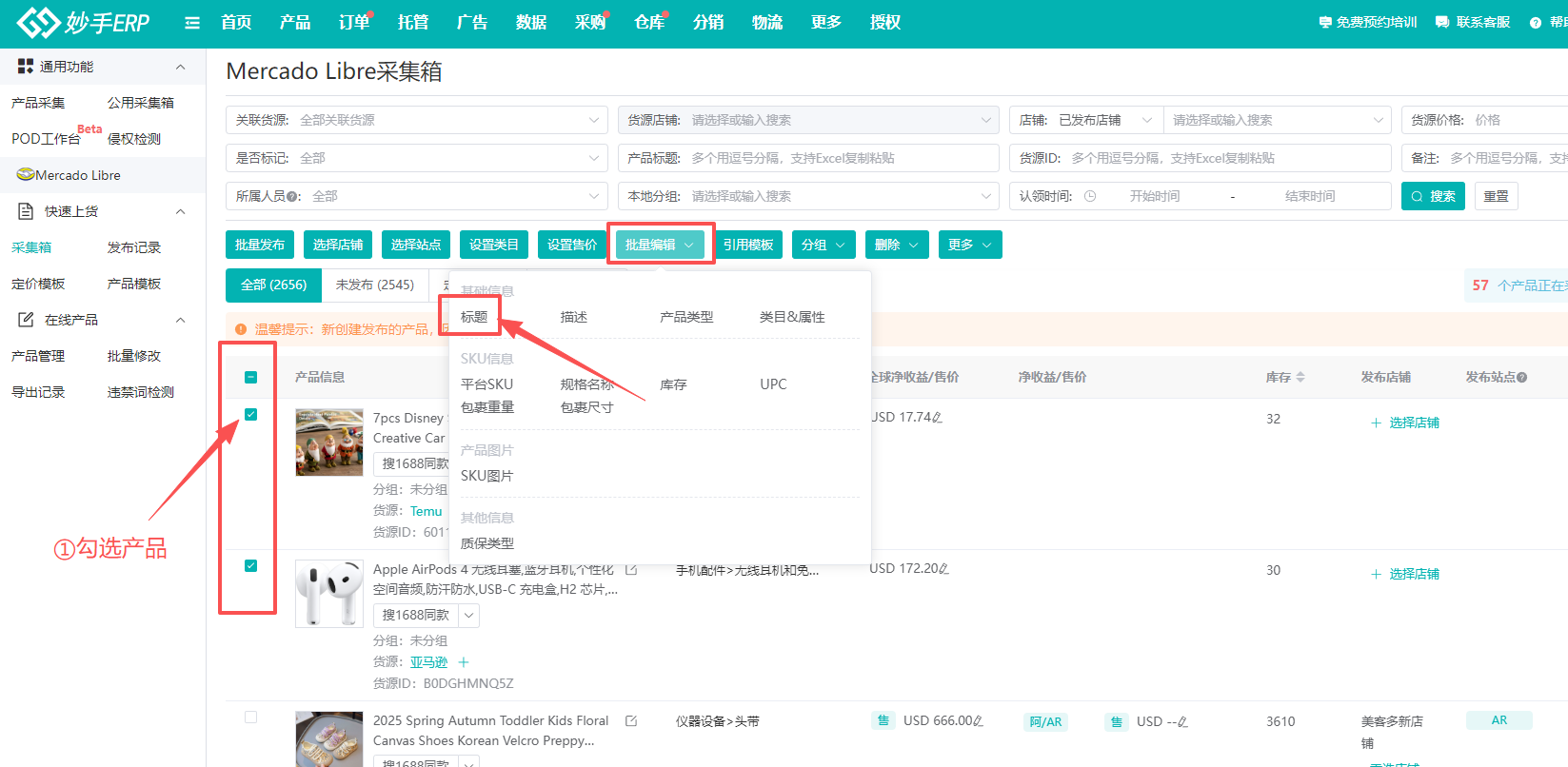 (2)批量编辑多个产品的情况下,勾选需要修改的产品,点击【批量编辑】=>标题