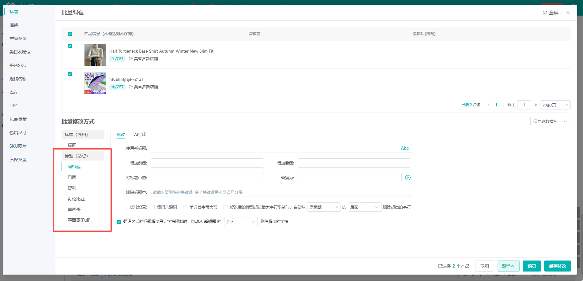 2、根据站点修改标题的功能,支持单产品设置以及批量设置