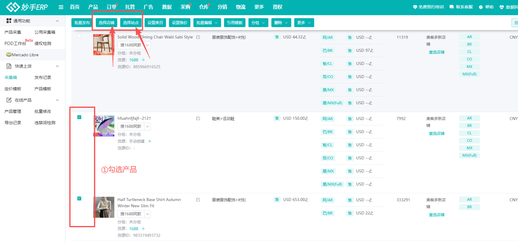 (1)勾选产品,先选择店铺,再选择需要发布的站点
