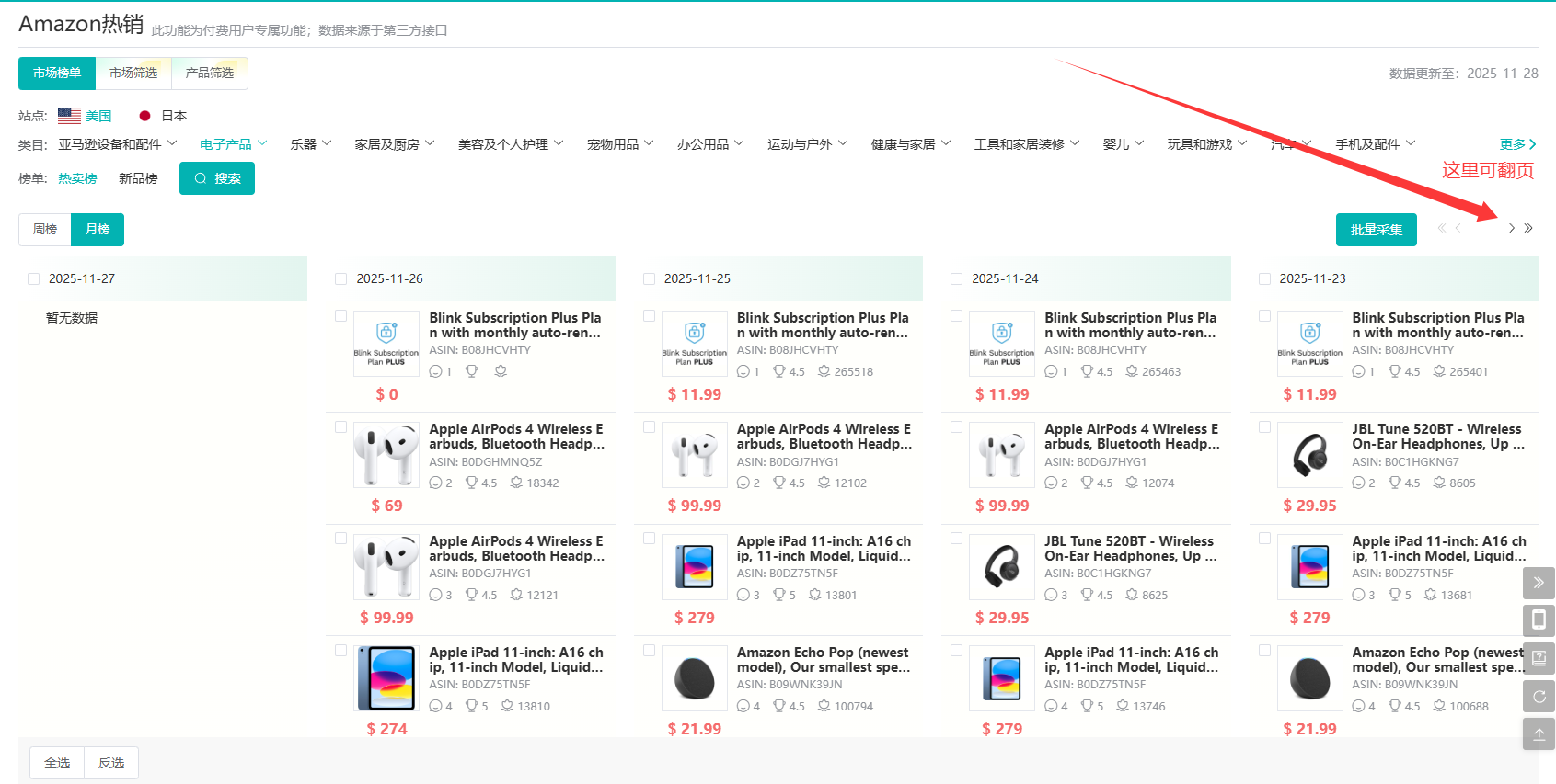 A:周榜/月榜首页都是显示最近5天的榜单,所以显示一致,可以在批量采集右侧进行翻页,查看其他天数的榜单