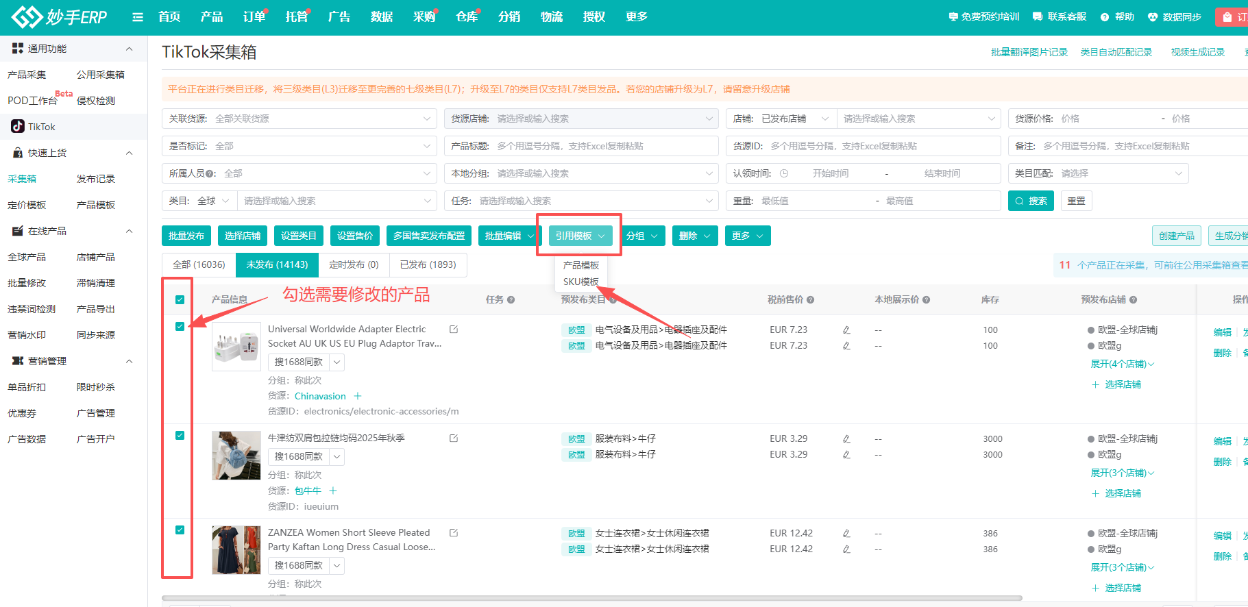 2、进入采集箱后,勾选需要修改的产品,点击【引用模板】=>SKU模板