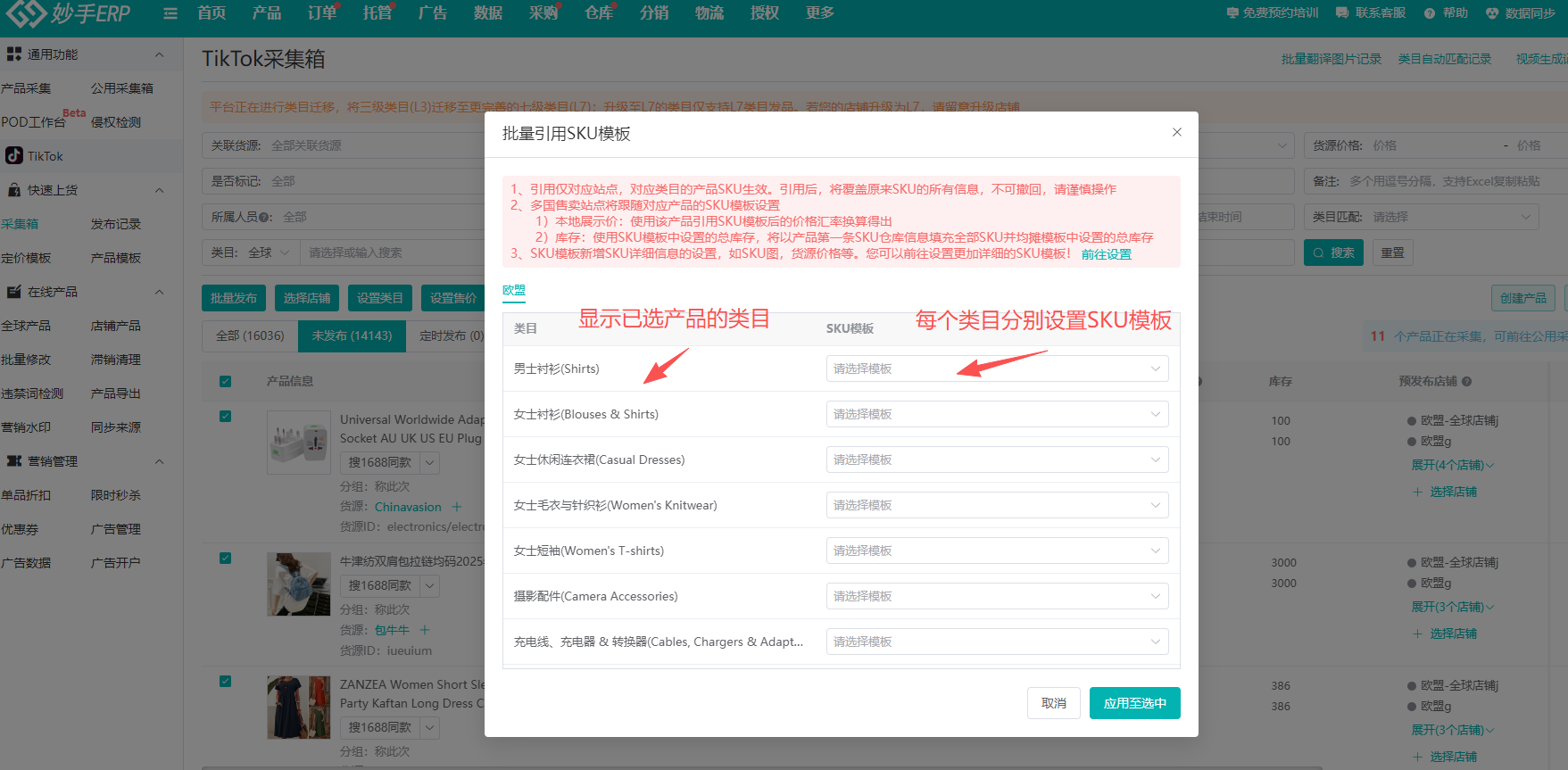 3、在弹窗中,每个类目对应要设置的SKU模板不同,需要给每个类目设置对应的SKU模板,引用后,将覆盖原来SKU的所有信息,不可撤回,请谨慎操作!