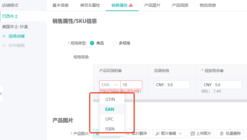 产品识别码有多种类型,当前您选择的类型和店铺后台的类型不一样,所以要求的尾数也不同。
