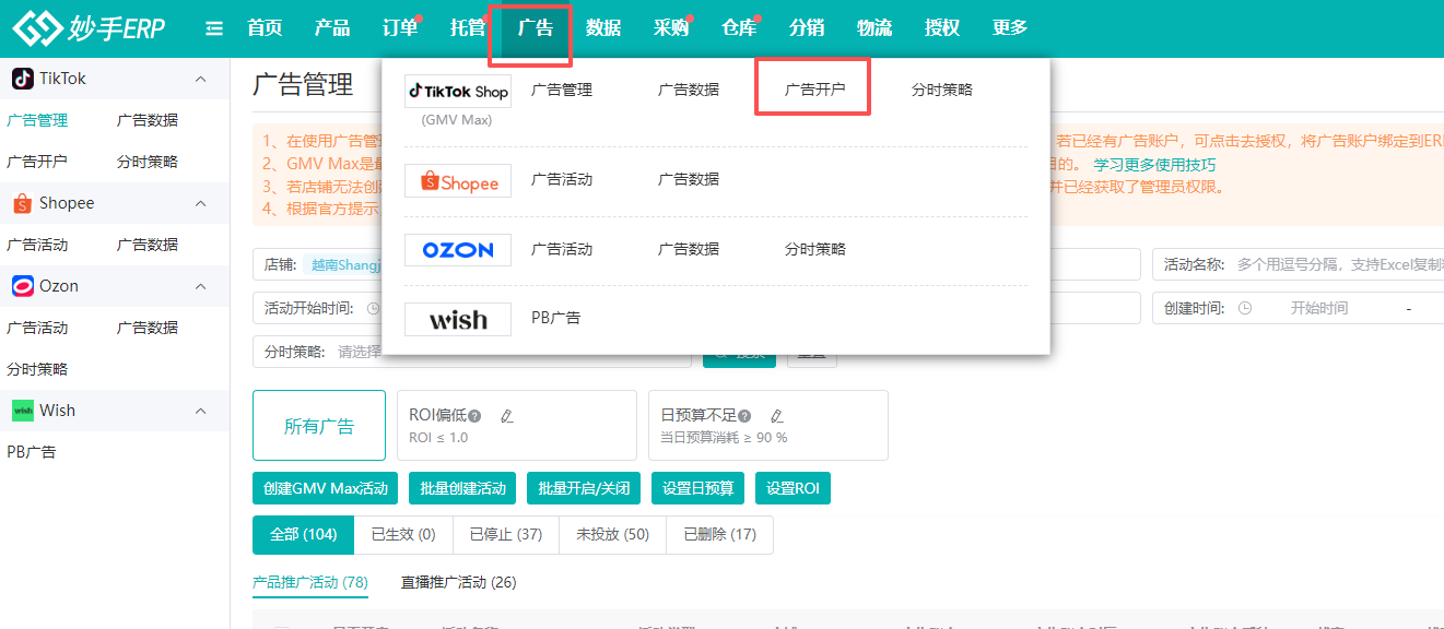 3、广告开户后,还支持在妙手ERP中创建广告,并查看广告数据情况,具体操作流程可查看:如何创建TikTok Shop GMV Max广告活动