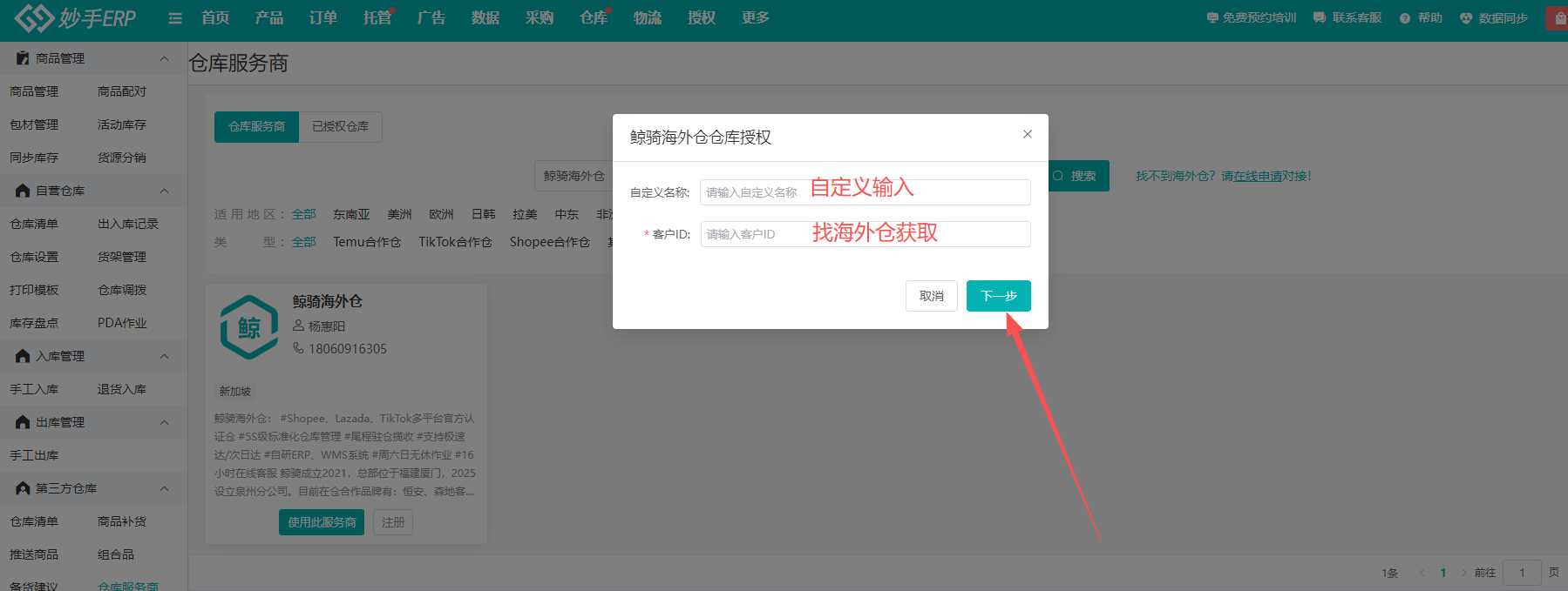 1、打开妙手ERP=>点击仓库=>第三方仓库=>仓库服务商