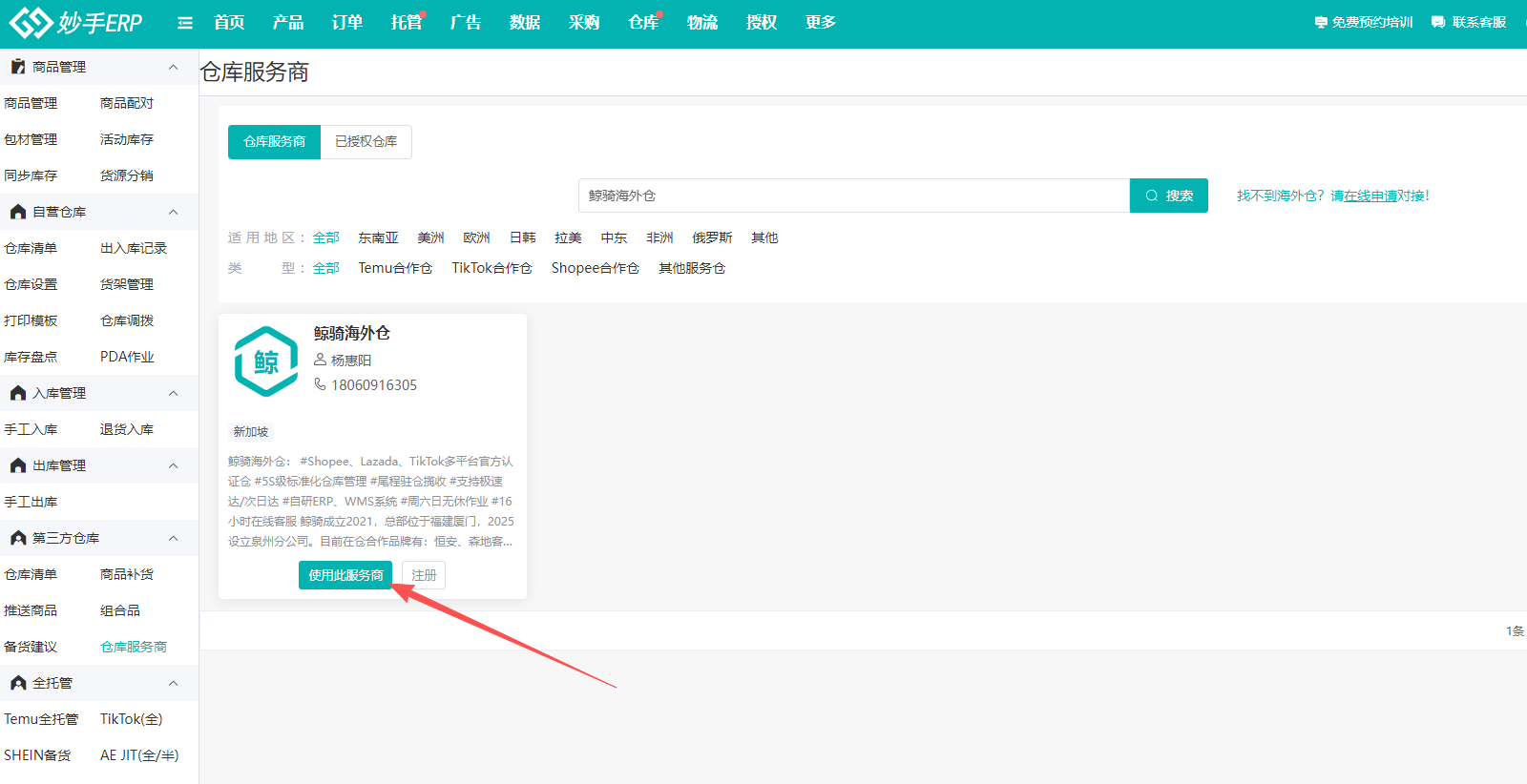 2、找到鲸骑海外仓,还未注册鲸骑海外仓,需要联系海外仓经理注册账号,开通账号后,点击鲸骑海外仓的【使用此服务商】