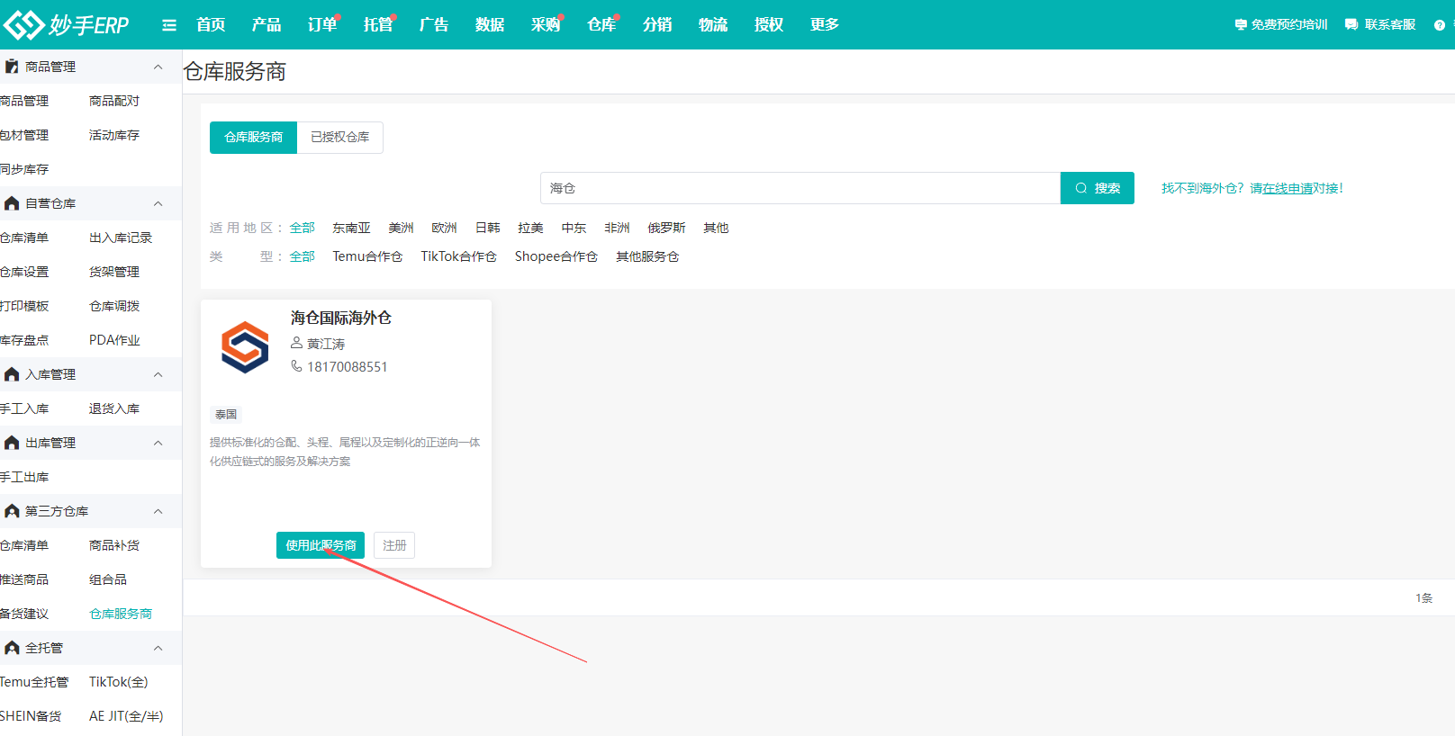 有账号的用户可直接点击海仓国际海外仓的【使用此服务商】