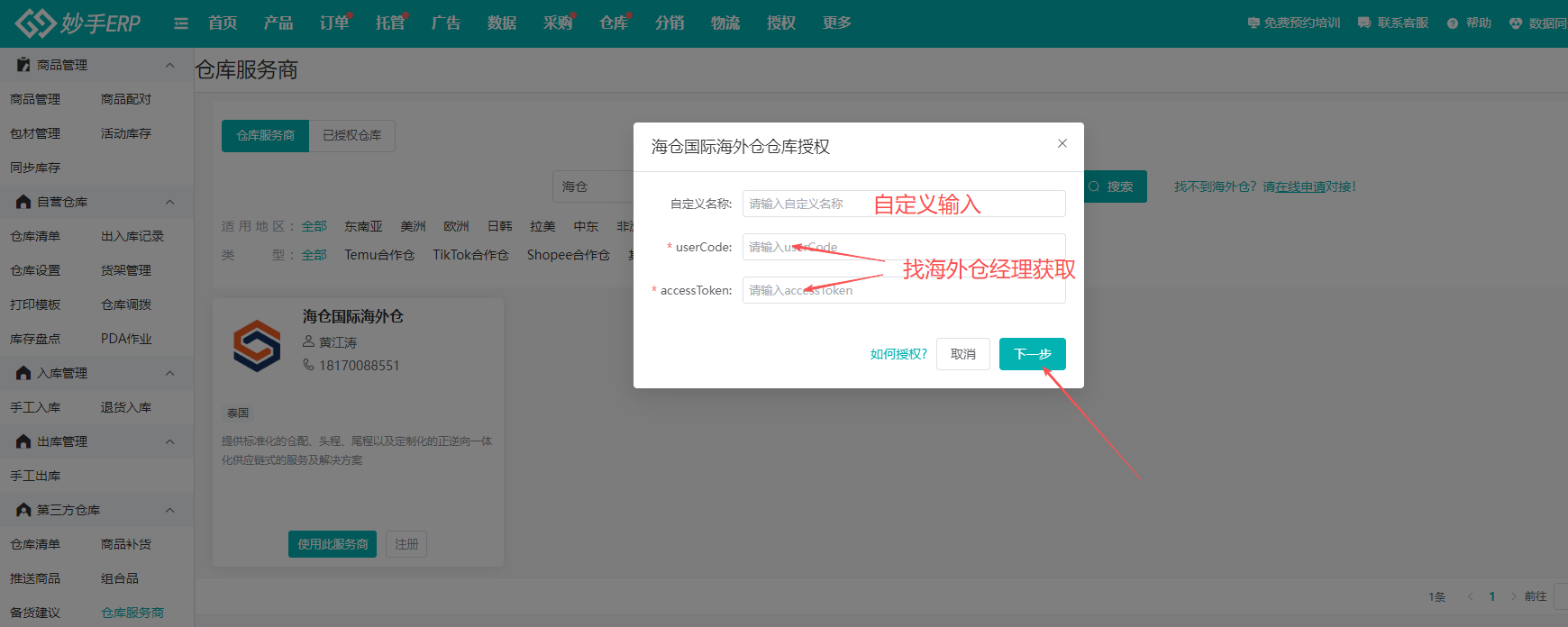 3、在弹窗中,需要自定义输入仓库名称, 需要填写的userCode和Access Token需要联系海外仓经理获取