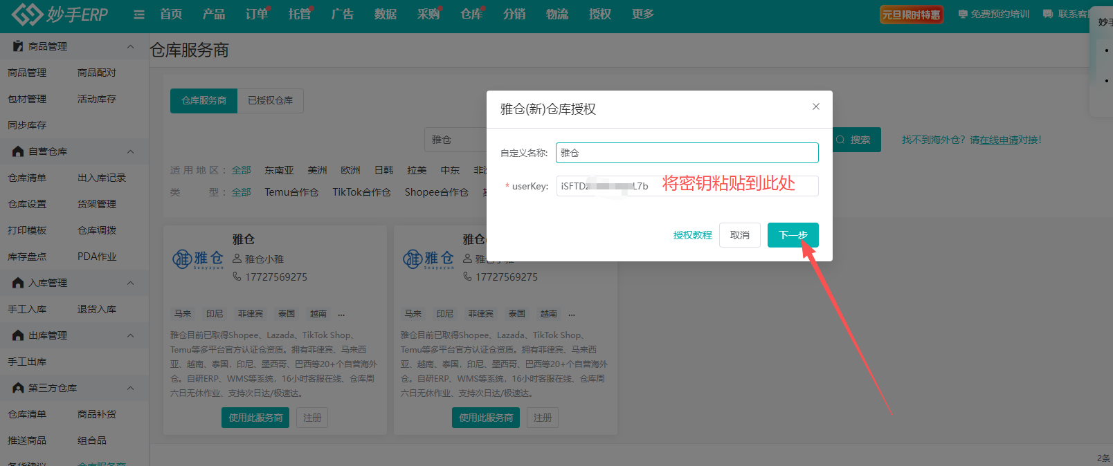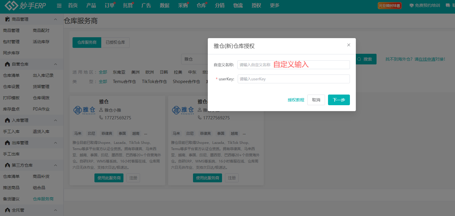 雅仓三方仓(新)授权教程