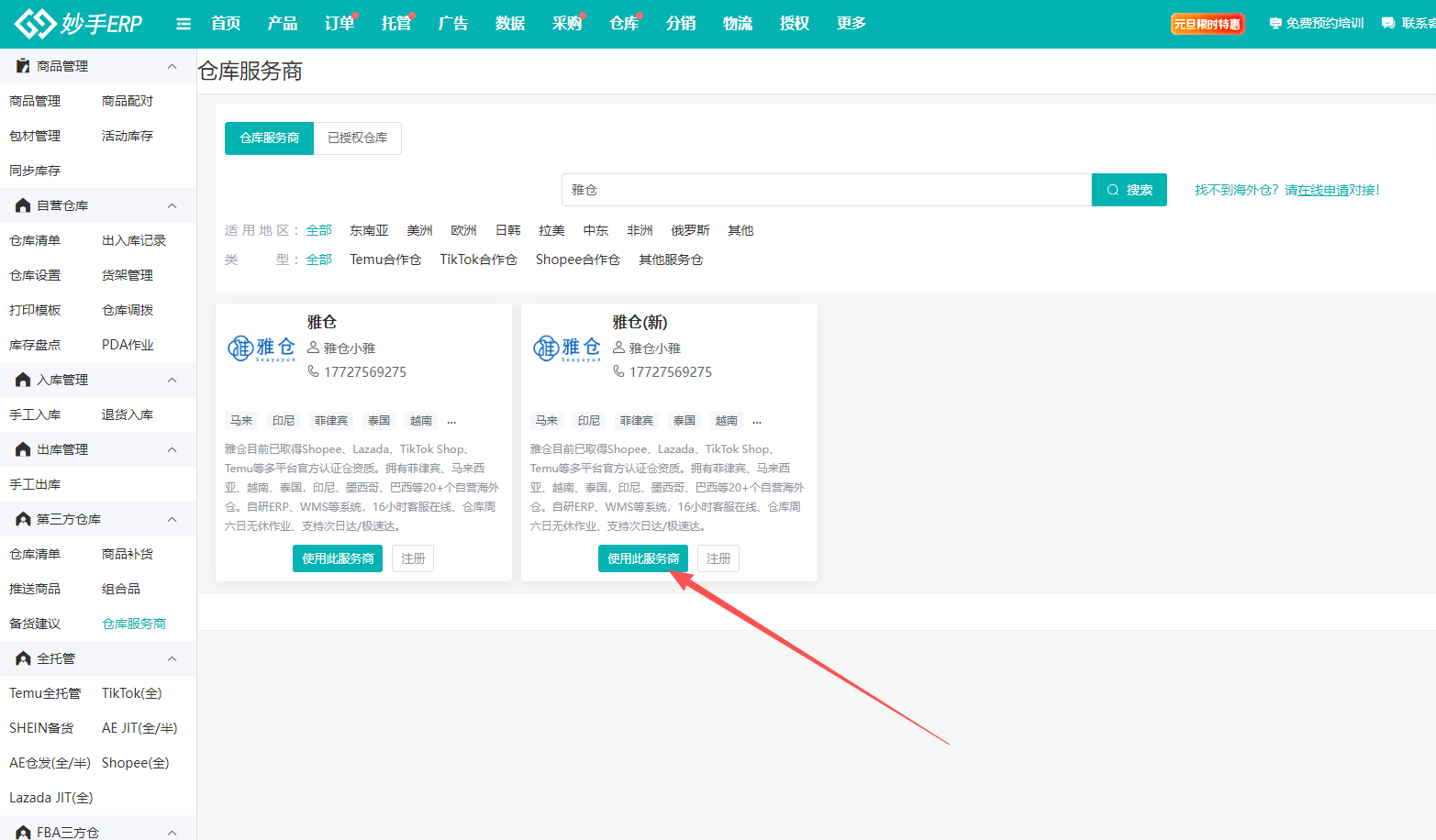 2、找到雅仓海外仓,目前有两个仓库名片,本教程讲解的是雅仓(新)的授权方法,可以与仓库确认需要授权的仓库