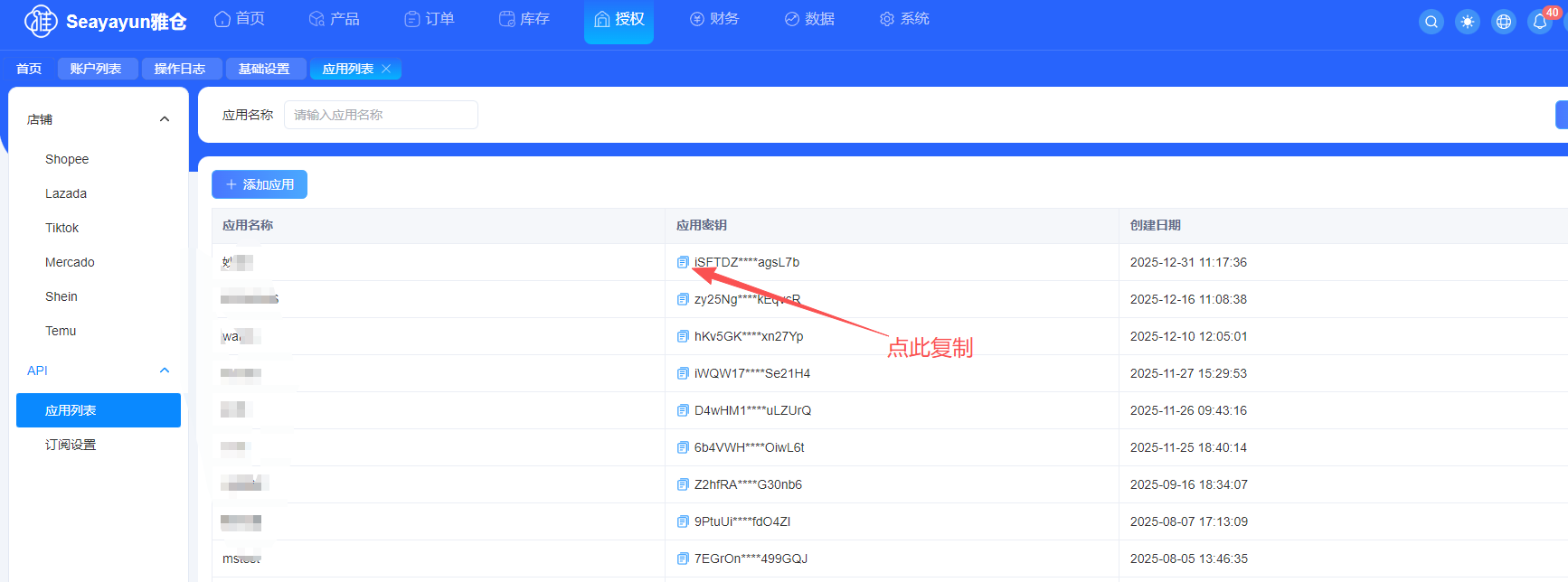 (4)创建后,复制密钥,并回到妙手ERP