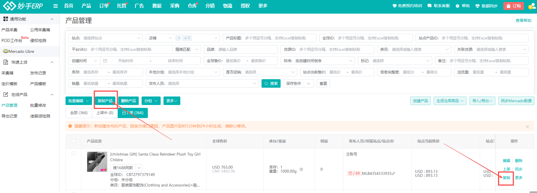 1、 已发布到美客多的店铺产品,可以使用妙手ERP的复制产品功能,重新发布产品,达到翻新产品的目的