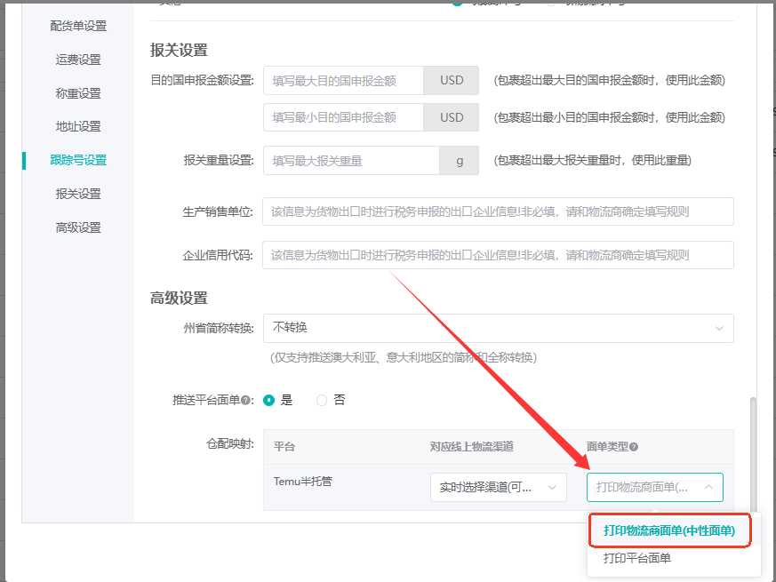 A:在物流-找到对应的三方物流渠道-设置,将仓配映射的面单类型改成打印物流商面单(中性面单),再打印面单即可打印出头程面单
