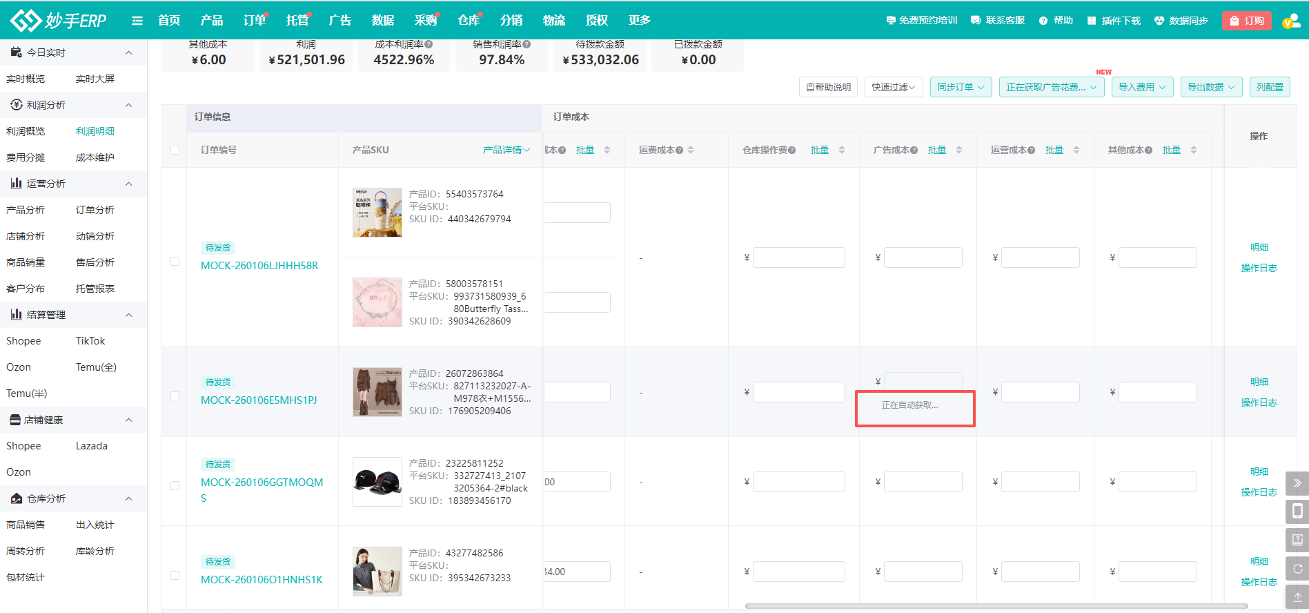 (4)符合时间范围内的订单会开始拉去广告成本,并显示:正在自动获取,获取完成后会显示最终结果