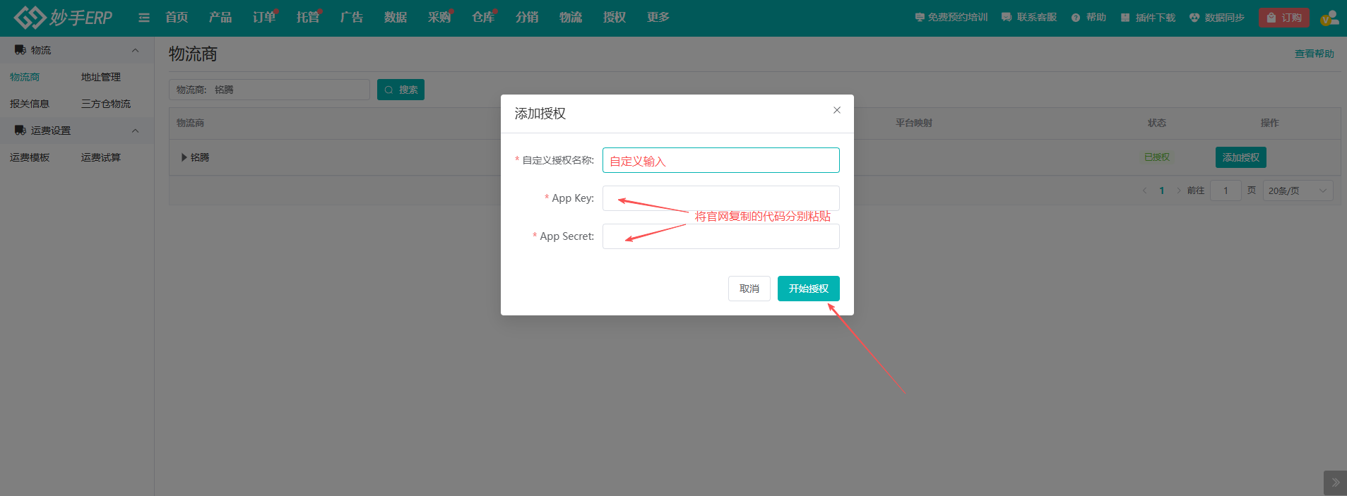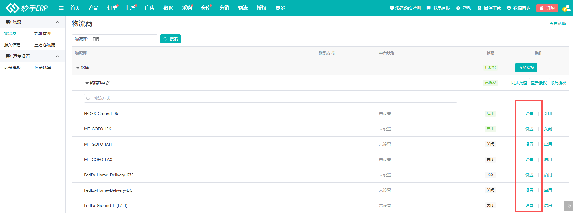 (2)进入妙手ERP,选择物流=>物流商=>找到铭腾物流,点击【添加授权】