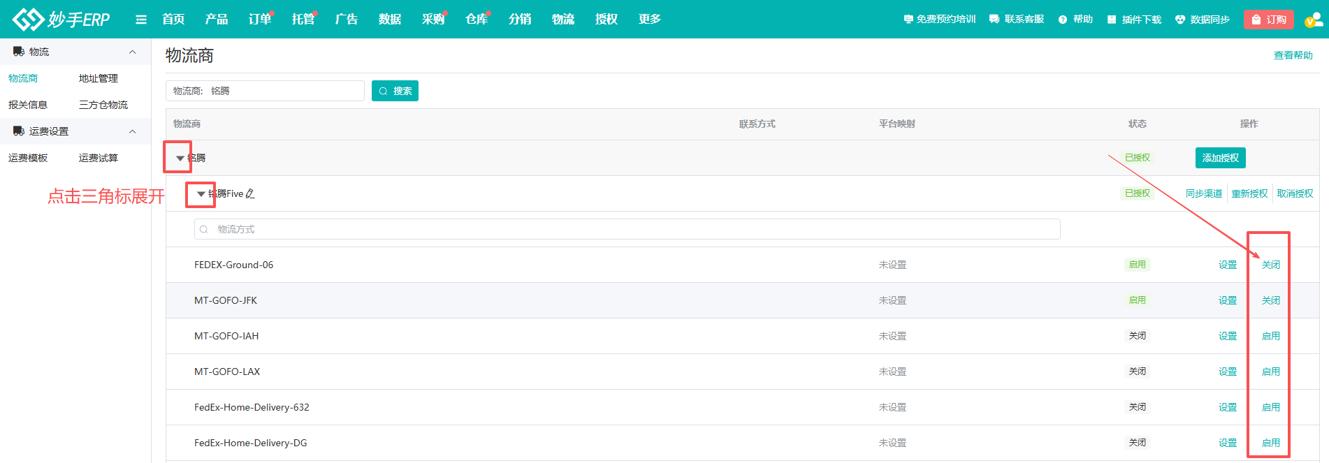 (5)授权后,点击三角标展开,选择需要启用的物流渠道,点击启用